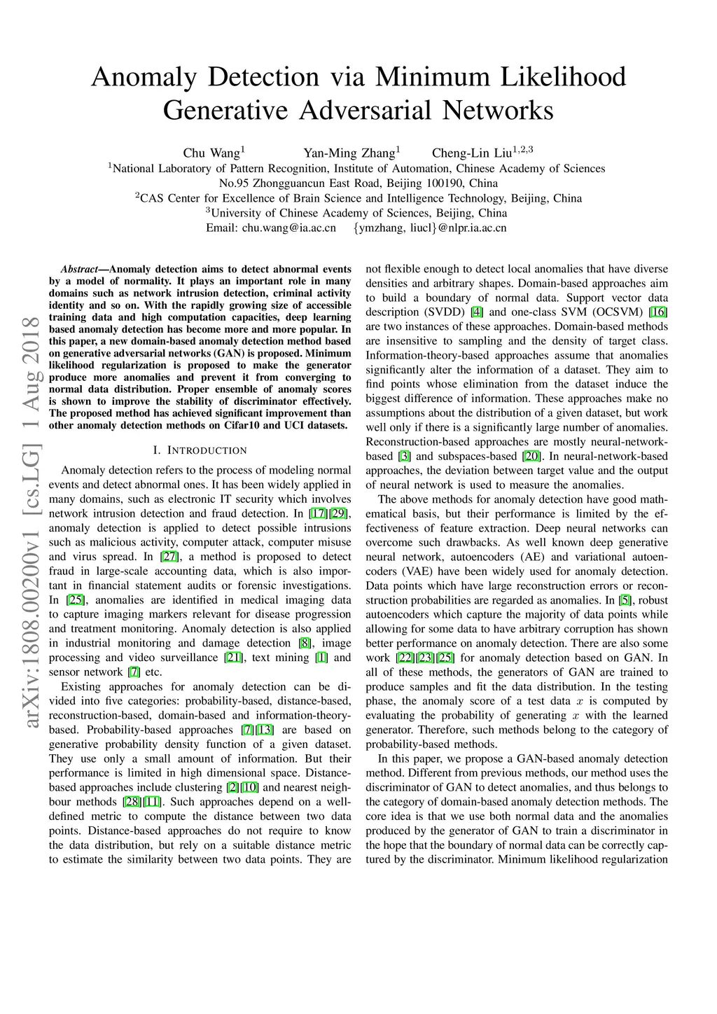 Anomaly detection aims to detect abnormal events by a model of normality. It plays an important role in many domains such as network intrusion detection, criminal activity identity and so on. With the rapidly growing size of accessible training data and high computation capacities, deep learning based anomaly detection has become more and more popular. In this paper, a new domain-based anomaly detection method based on generative adversarial networks (GAN) is proposed. Minimum likelihood regularization is proposed to make the generator produce more anomalies and prevent it from converging to normal data distribution. Proper ensemble of anomaly scores is shown to improve the stability of discriminator effectively. The proposed method has achieved significant improvement than other anomaly detection methods on Cifar10 and UCI datasets.