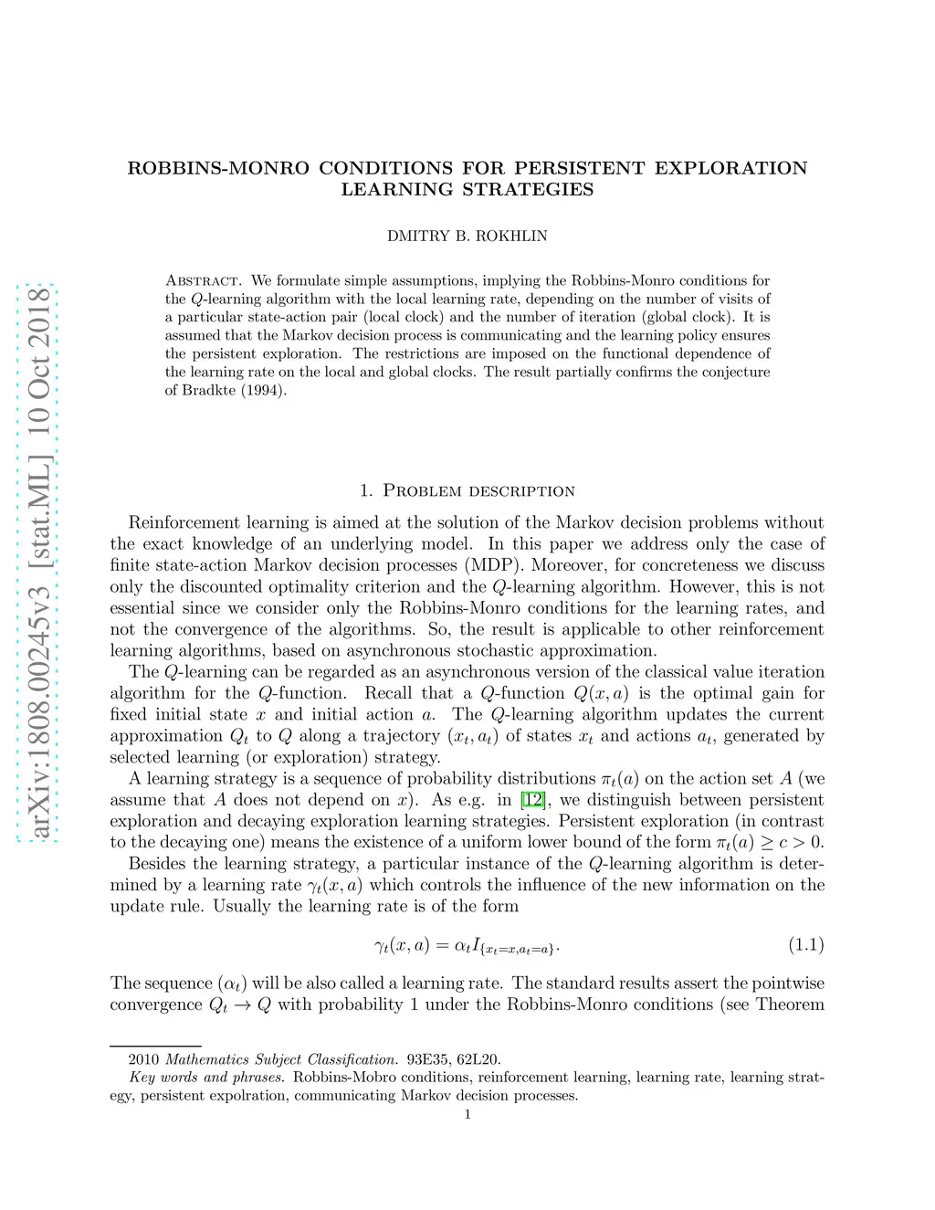 We formulate simple assumptions, implying the Robbins-Monro conditions for the -learning algorithm with the local learning rate, depending on the number of visits of a particular state-action pair (local clock) and the number of iteration (global clock). It is assumed that the Markov decision process is communicating and the learning policy ensures the persistent exploration. The restrictions are imposed on the functional dependence of the learning rate on the local and global clocks. The result partially confirms the conjecture of Bradkte (1994).