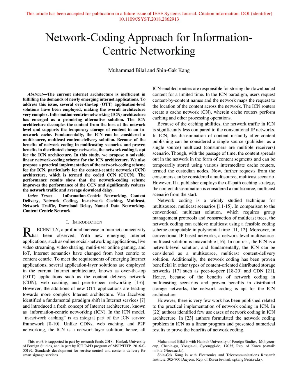 The current internet architecture is inefficient in fulfilling the demands of newly emerging internet applications. To address this issue, several over-the-top (OTT) application-level solutions have been employed, making the overall architecture very complex. Information-centric-networking (ICN) architecture has emerged as a promising alternative solution. The ICN architecture decouples the content from the host at the network level and supports the temporary storage of content in an in-network cache. Fundamentally, the ICN can be considered a multisource, multicast content-delivery solution. Because of the benefits of network coding in multicasting scenarios and proven benefits in distributed storage networks, the network coding is apt for the ICN architecture. In this study, we propose a solvable linear network-coding scheme for the ICN architecture. We also propose a practical implementation of the network-coding scheme for the ICN, particularly for the content-centric network (CCN) architecture, which is termed the coded CCN (CCCN). The performance results show that the network-coding scheme improves the performance of the CCN and significantly reduces the network traffic and average download delay.