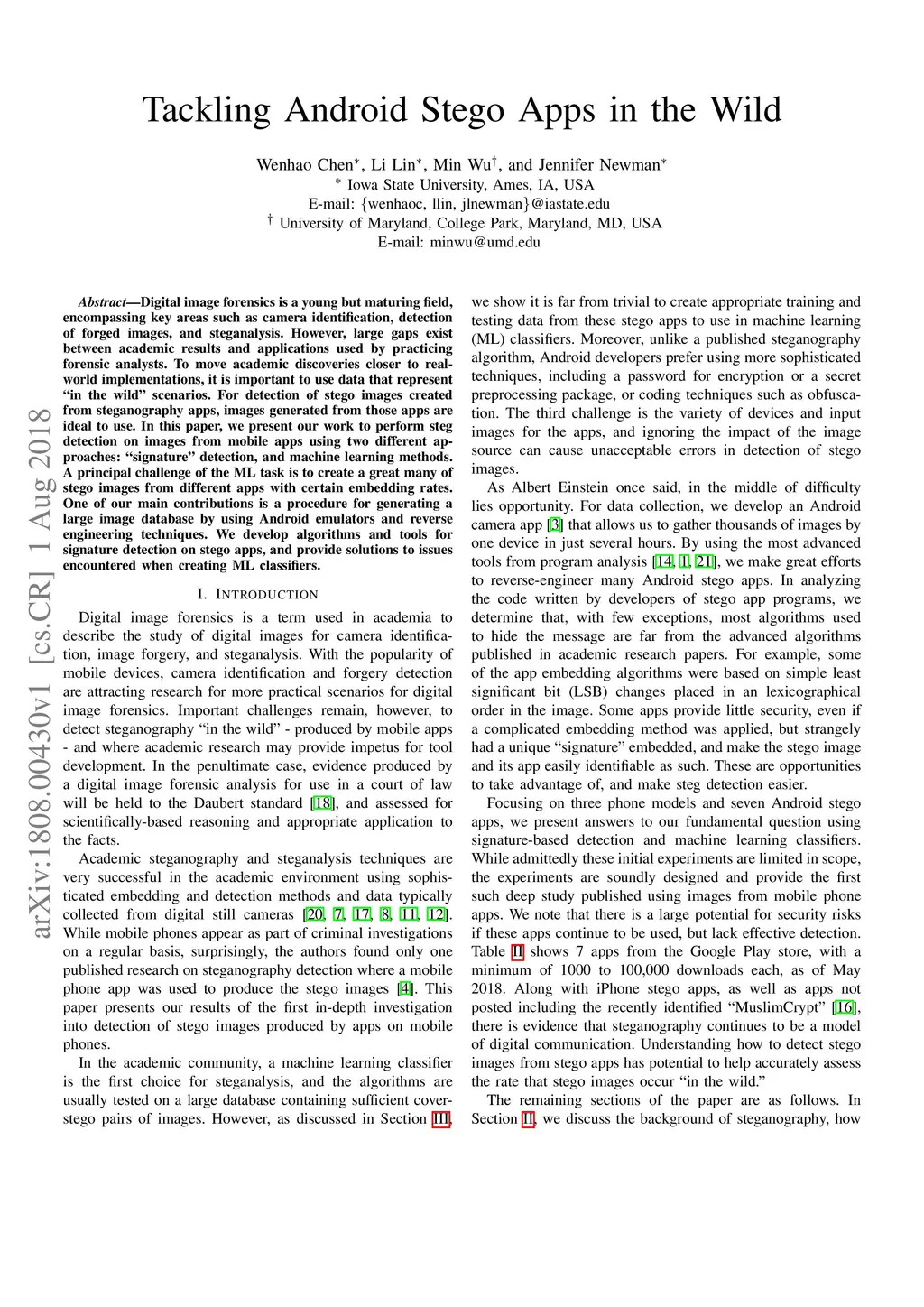 Digital image forensics is a young but maturing field, encompassing key areas such as camera identification, detection of forged images, and steganalysis. However, large gaps exist between academic results and applications used by practicing forensic analysts. To move academic discoveries closer to real-world implementations, it is important to use data that represent "in the wild" scenarios. For detection of stego images created from steganography apps, images generated from those apps are ideal to use. In this paper, we present our work to perform steg detection on images from mobile apps using two different approaches: "signature" detection, and machine learning methods. A principal challenge of the ML task is to create a great many of stego images from different apps with certain embedding rates. One of our main contributions is a procedure for generating a large image database by using Android emulators and reverse engineering techniques. We develop algorithms and tools for signature detection on stego apps, and provide solutions to issues encountered when creating ML classifiers.
