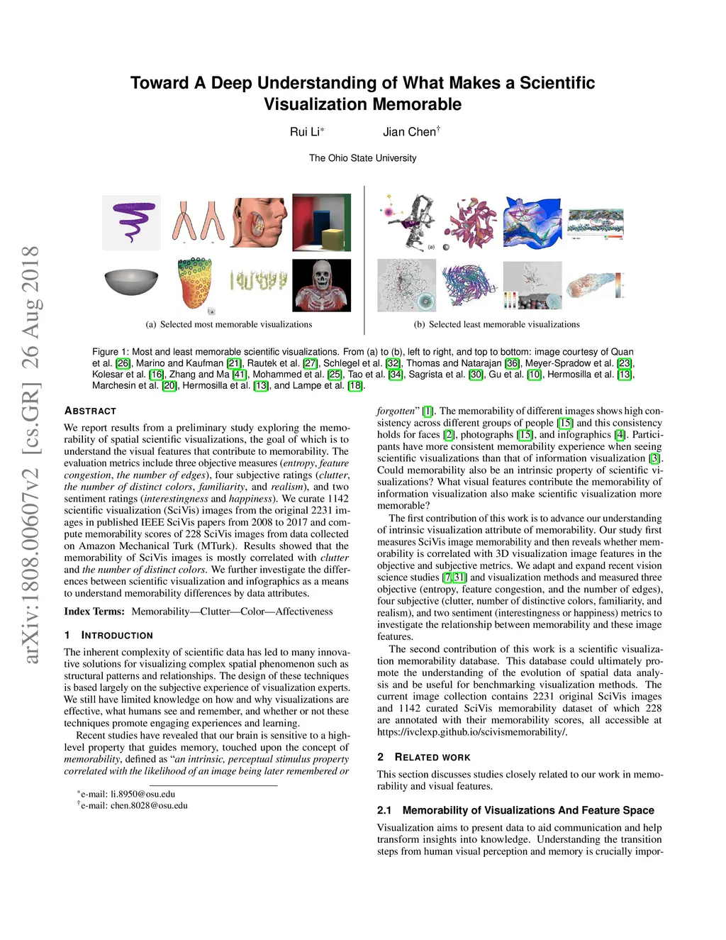 We report results from a preliminary study exploring the memorability of spatial scientific visualizations, the goal of which is to understand the visual features that contribute to memorability. The evaluation metrics include three objective measures (entropy, feature congestion, the number of edges), four subjective ratings (clutter, the number of distinct colors, familiarity, and realism), and two sentiment ratings (interestingness and happiness). We curate 1142 scientific visualization (SciVis) images from the original 2231 images in published IEEE SciVis papers from 2008 to 2017 and compute memorability scores of 228 SciVis images from data collected on Amazon Mechanical Turk (MTurk). Results showed that the memorability of SciVis images is mostly correlated with clutter and the number of distinct colors. We further investigate the differences between scientific visualization and infographics as a means to understand memorability differences by data attributes.