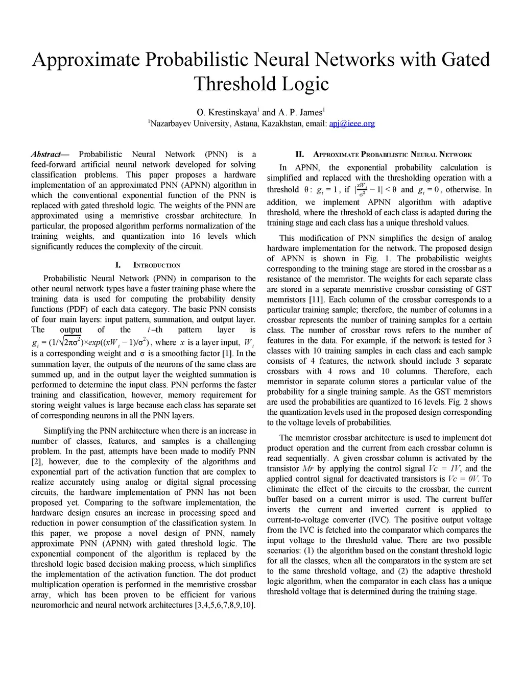 Probabilistic Neural Network (PNN) is a feed-forward artificial neural network developed for solving classification problems. This paper proposes a hardware implementation of an approximated PNN (APNN) algorithm in which the conventional exponential function of the PNN is replaced with gated threshold logic. The weights of the PNN are approximated using a memristive crossbar architecture. In particular, the proposed algorithm performs normalization of the training weights, and quantization into 16 levels which significantly reduces the complexity of the circuit.