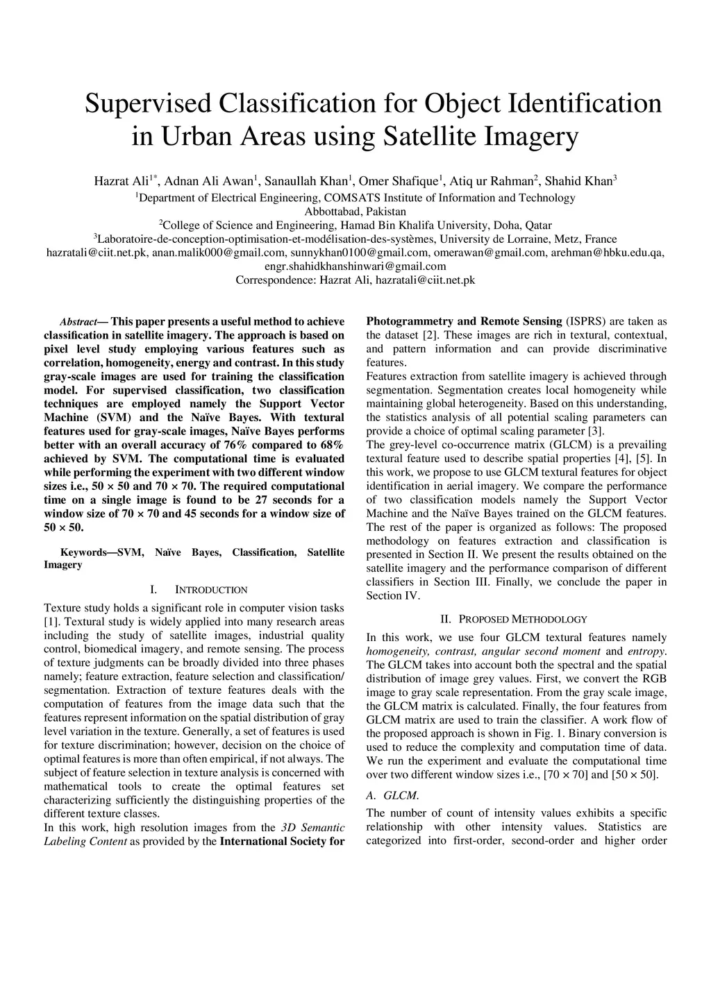 This paper presents a useful method to achieve classification in satellite imagery. The approach is based on pixel level study employing various features such as correlation, homogeneity, energy and contrast. In this study gray-scale images are used for training the classification model. For supervised classification, two classification techniques are employed namely the Support Vector Machine (SVM) and the Naive Bayes. With textural features used for gray-scale images, Naive Bayes performs better with an overall accuracy of 76% compared to 68% achieved by SVM. The computational time is evaluated while performing the experiment with two different window sizes i.e., 50x50 and 70x70. The required computational time on a single image is found to be 27 seconds for a window size of 70x70 and 45 seconds for a window size of 50x50.