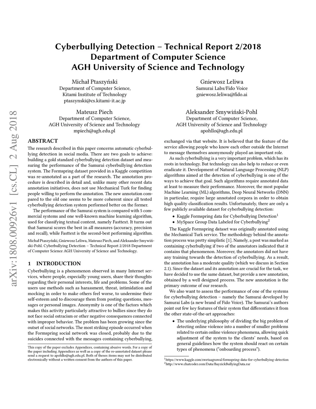 Cyberbullying Detection -- Technical Report 2/2018, Department of