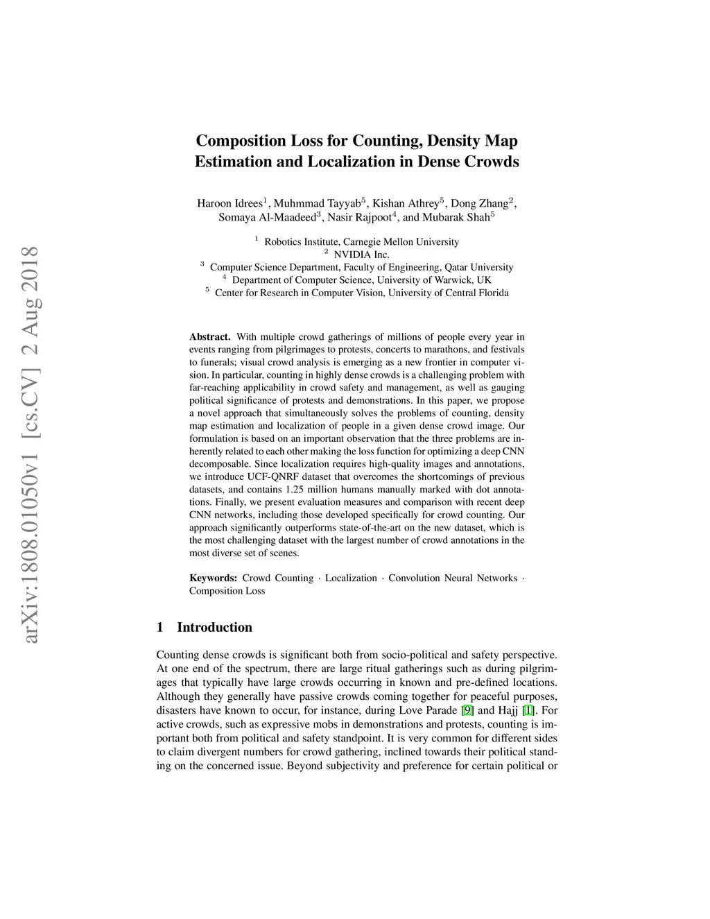 With multiple crowd gatherings of millions of people every year in events ranging from pilgrimages to protests, concerts to marathons, and festivals to funerals; visual crowd analysis is emerging as a new frontier in computer vision. In particular, counting in highly dense crowds is a challenging problem with far-reaching applicability in crowd safety and management, as well as gauging political significance of protests and demonstrations. In this paper, we propose a novel approach that simultaneously solves the problems of counting, density map estimation and localization of people in a given dense crowd image. Our formulation is based on an important observation that the three problems are inherently related to each other making the loss function for optimizing a deep CNN decomposable. Since localization requires high-quality images and annotations, we introduce UCF-QNRF dataset that overcomes the shortcomings of previous datasets, and contains 1.25 million humans manually marked with dot annotations. Finally, we present evaluation measures and comparison with recent deep CNN networks, including those developed specifically for crowd counting. Our approach significantly outperforms state-of-the-art on the new dataset, which is the most challenging dataset with the largest number of crowd annotations in the most diverse set of scenes.