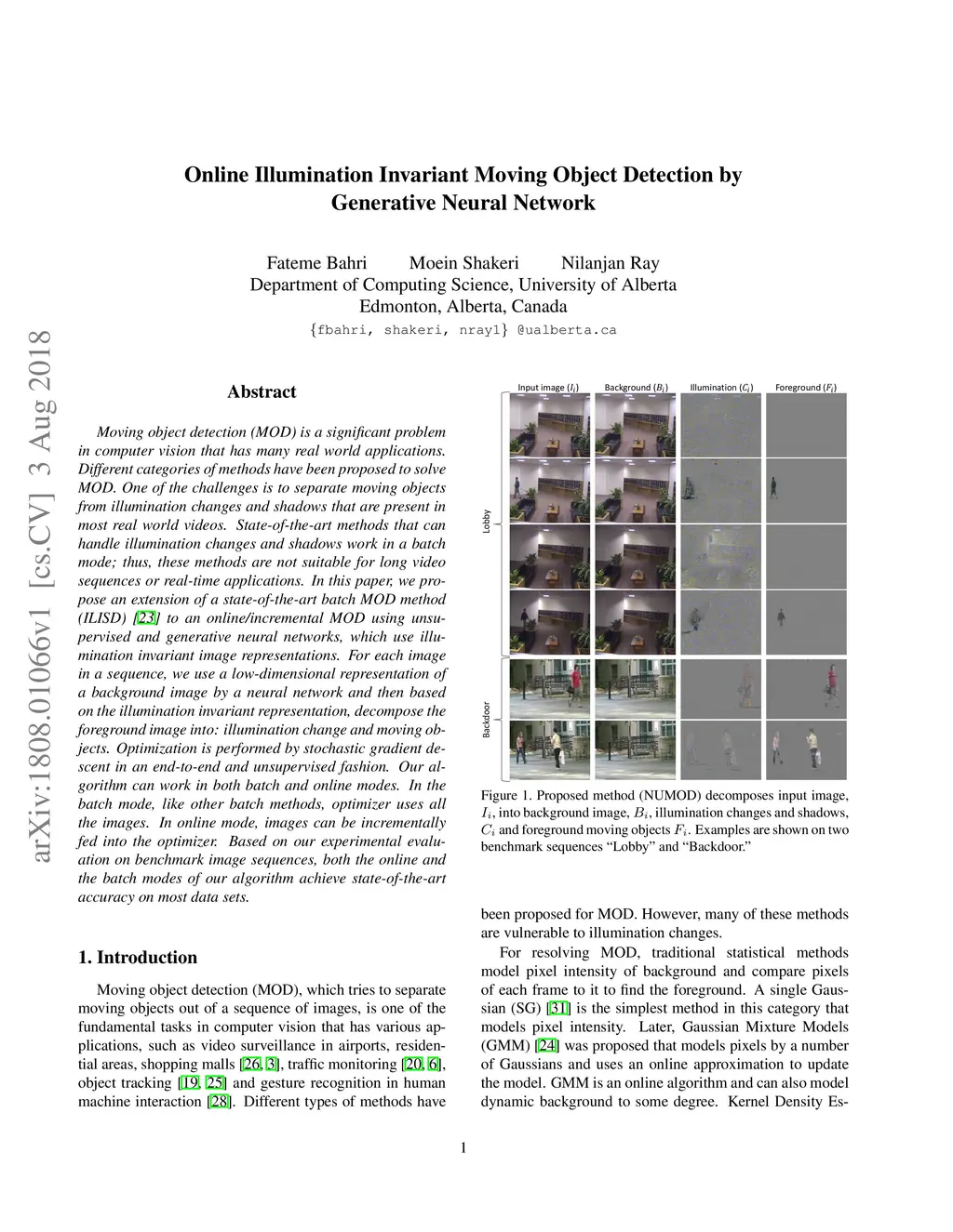 Moving object detection (MOD) is a significant problem in computer vision that has many real world applications. Different categories of methods have been proposed to solve MOD. One of the challenges is to separate moving objects from illumination changes and shadows that are present in most real world videos. State-of-the-art methods that can handle illumination changes and shadows work in a batch mode; thus, these methods are not suitable for long video sequences or real-time applications. In this paper, we propose an extension of a state-of-the-art batch MOD method (ILISD) to an online/incremental MOD using unsupervised and generative neural networks, which use illumination invariant image representations. For each image in a sequence, we use a low-dimensional representation of a background image by a neural network and then based on the illumination invariant representation, decompose the foreground image into: illumination change and moving objects. Optimization is performed by stochastic gradient descent in an end-to-end and unsupervised fashion. Our algorithm can work in both batch and online modes. In the batch mode, like other batch methods, optimizer uses all the images. In online mode, images can be incrementally fed into the optimizer. Based on our experimental evaluation on benchmark image sequences, both the online and the batch modes of our algorithm achieve state-of-the-art accuracy on most data sets.