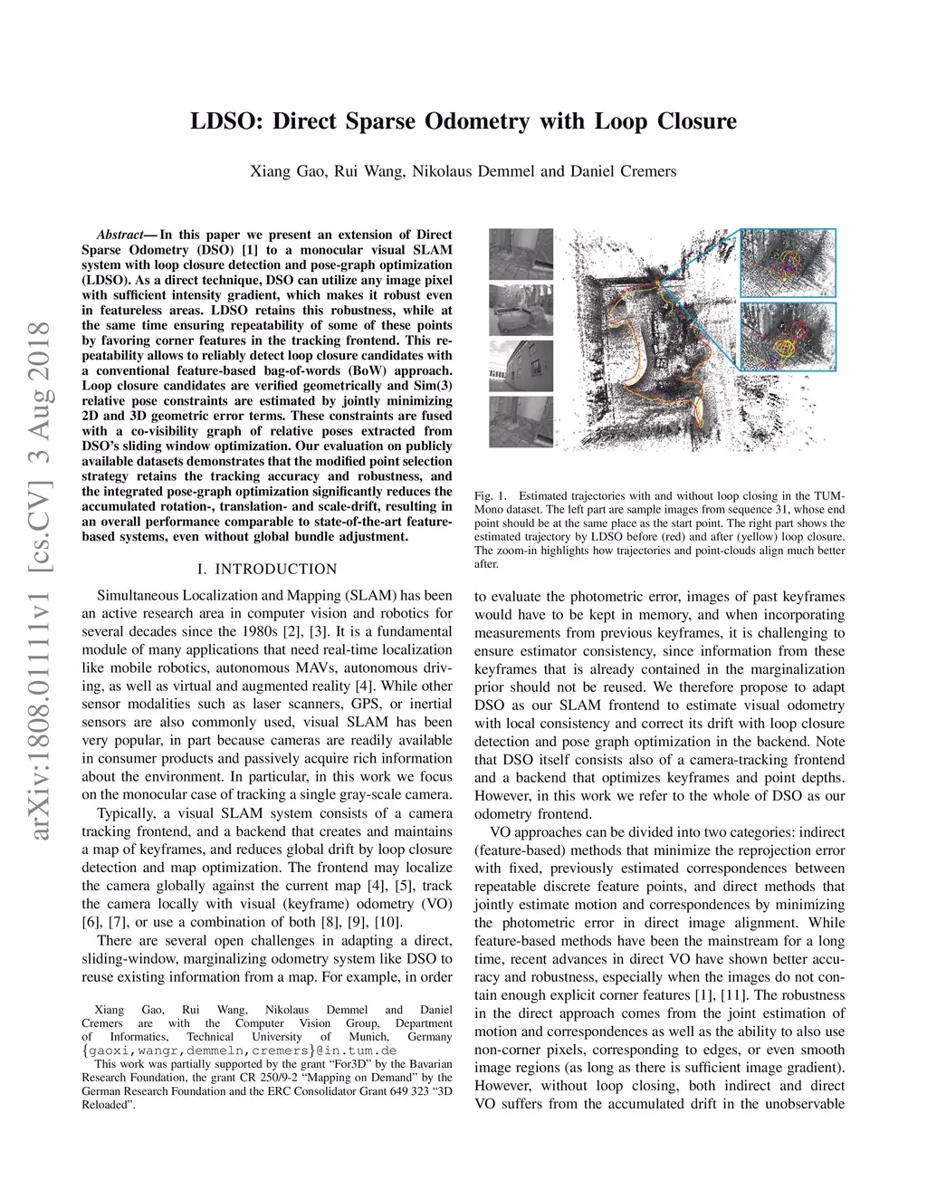In this paper we present an extension of Direct Sparse Odometry (DSO) to a monocular visual SLAM system with loop closure detection and pose-graph optimization (LDSO). As a direct technique, DSO can utilize any image pixel with sufficient intensity gradient, which makes it robust even in featureless areas. LDSO retains this robustness, while at the same time ensuring repeatability of some of these points by favoring corner features in the tracking frontend. This repeatability allows to reliably detect loop closure candidates with a conventional feature-based bag-of-words (BoW) approach. Loop closure candidates are verified geometrically and Sim(3) relative pose constraints are estimated by jointly minimizing 2D and 3D geometric error terms. These constraints are fused with a co-visibility graph of relative poses extracted from DSO's sliding window optimization. Our evaluation on publicly available datasets demonstrates that the modified point selection strategy retains the tracking accuracy and robustness, and the integrated pose-graph optimization significantly reduces the accumulated rotation-, translation- and scale-drift, resulting in an overall performance comparable to state-of-the-art feature-based systems, even without global bundle adjustment.