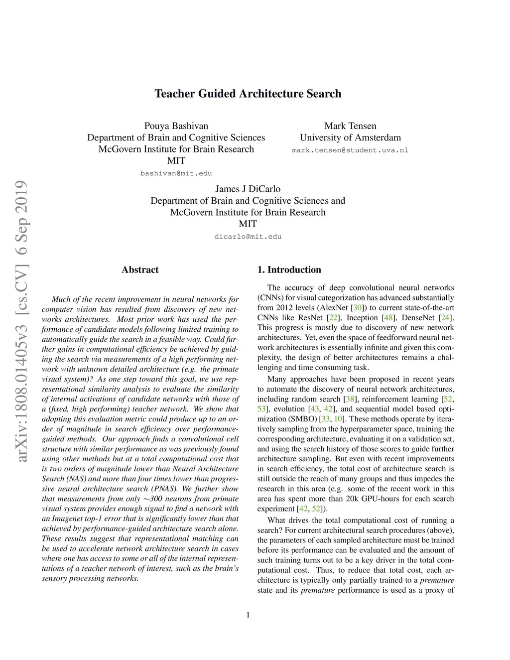 Much of the recent improvement in neural networks for computer vision has resulted from discovery of new networks architectures. Most prior work has used the performance of candidate models following limited training to automatically guide the search in a feasible way. Could further gains in computational efficiency be achieved by guiding the search via measurements of a high performing network with unknown detailed architecture (e.g. the primate visual system)? As one step toward this goal, we use representational similarity analysis to evaluate the similarity of internal activations of candidate networks with those of a (fixed, high performing) teacher network. We show that adopting this evaluation metric could produce up to an order of magnitude in search efficiency over performance-guided methods. Our approach finds a convolutional cell structure with similar performance as was previously found using other methods but at a total computational cost that is two orders of magnitude lower than Neural Architecture Search (NAS) and more than four times lower than progressive neural architecture search (PNAS). We further show that measurements from only ~300 neurons from primate visual system provides enough signal to find a network with an Imagenet top-1 error that is significantly lower than that achieved by performance-guided architecture search alone. These results suggest that representational matching can be used to accelerate network architecture search in cases where one has access to some or all of the internal representations of a teacher network of interest, such as the brain's sensory processing networks.
