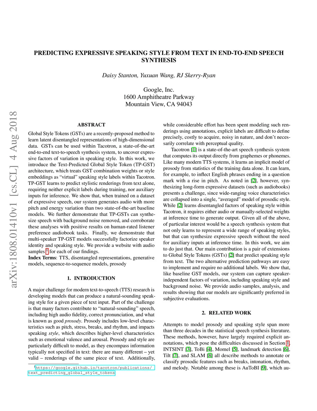 Global Style Tokens (GSTs) are a recently-proposed method to learn latent disentangled representations of high-dimensional data. GSTs can be used within Tacotron, a state-of-the-art end-to-end text-to-speech synthesis system, to uncover expressive factors of variation in speaking style. In this work, we introduce the Text-Predicted Global Style Token (TP-GST) architecture, which treats GST combination weights or style embeddings as "virtual" speaking style labels within Tacotron. TP-GST learns to predict stylistic renderings from text alone, requiring neither explicit labels during training nor auxiliary inputs for inference. We show that, when trained on a dataset of expressive speech, our system generates audio with more pitch and energy variation than two state-of-the-art baseline models. We further demonstrate that TP-GSTs can synthesize speech with background noise removed, and corroborate these analyses with positive results on human-rated listener preference audiobook tasks. Finally, we demonstrate that multi-speaker TP-GST models successfully factorize speaker identity and speaking style. We provide a website with audio samples for each of our findings.