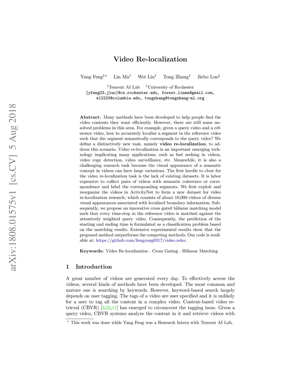 Many methods have been developed to help people find the video contents they want efficiently. However, there are still some unsolved problems in this area. For example, given a query video and a reference video, how to accurately localize a segment in the reference video such that the segment semantically corresponds to the query video? We define a distinctively new task, namely \textbf{video re-localization}, to address this scenario. Video re-localization is an important emerging technology implicating many applications, such as fast seeking in videos, video copy detection, video surveillance, etc. Meanwhile, it is also a challenging research task because the visual appearance of a semantic concept in videos can have large variations. The first hurdle to clear for the video re-localization task is the lack of existing datasets. It is labor expensive to collect pairs of videos with semantic coherence or correspondence and label the corresponding segments. We first exploit and reorganize the videos in ActivityNet to form a new dataset for video re-localization research, which consists of about 10,000 videos of diverse visual appearances associated with localized boundary information. Subsequently, we propose an innovative cross gated bilinear matching model such that every time-step in the reference video is matched against the attentively weighted query video. Consequently, the prediction of the starting and ending time is formulated as a classification problem based on the matching results. Extensive experimental results show that the proposed method outperforms the competing methods. Our code is available at: https://github.com/fengyang0317/video_reloc.