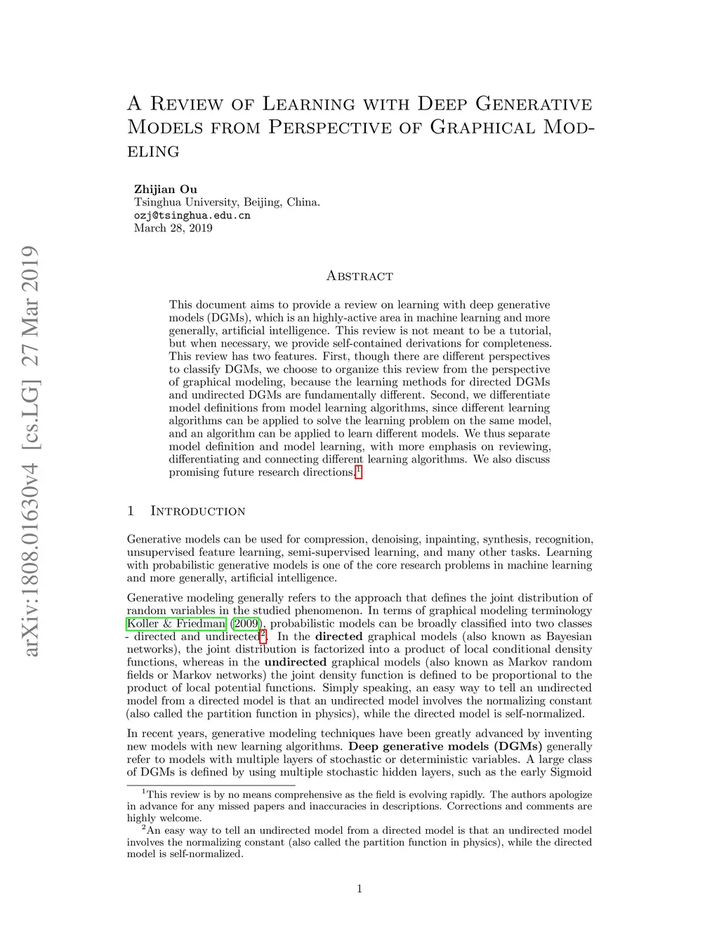 This document aims to provide a review on learning with deep generative models (DGMs), which is an highly-active area in machine learning and more generally, artificial intelligence. This review is not meant to be a tutorial, but when necessary, we provide self-contained derivations for completeness. This review has two features. First, though there are different perspectives to classify DGMs, we choose to organize this review from the perspective of graphical modeling, because the learning methods for directed DGMs and undirected DGMs are fundamentally different. Second, we differentiate model definitions from model learning algorithms, since different learning algorithms can be applied to solve the learning problem on the same model, and an algorithm can be applied to learn different models. We thus separate model definition and model learning, with more emphasis on reviewing, differentiating and connecting different learning algorithms. We also discuss promising future research directions.