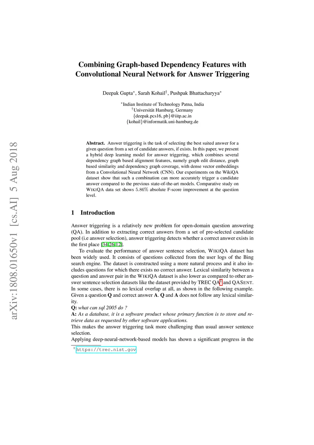 Answer triggering is the task of selecting the best-suited answer for a given question from a set of candidate answers if exists. In this paper, we present a hybrid deep learning model for answer triggering, which combines several dependency graph based alignment features, namely graph edit distance, graph-based similarity and dependency graph coverage, with dense vector embeddings from a Convolutional Neural Network (CNN). Our experiments on the WikiQA dataset show that such a combination can more accurately trigger a candidate answer compared to the previous state-of-the-art models. Comparative study on WikiQA dataset shows 5.86% absolute F-score improvement at the question level.