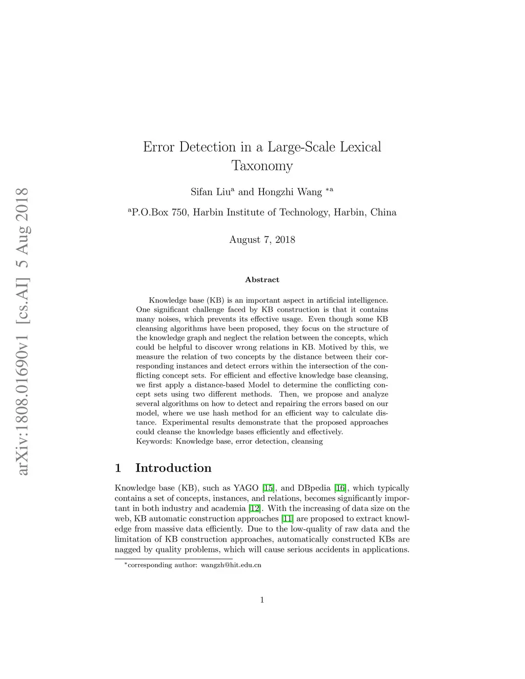 Knowledge base (KB) is an important aspect in artificial intelligence. One significant challenge faced by KB construction is that it contains many noises, which prevents its effective usage. Even though some KB cleansing algorithms have been proposed, they focus on the structure of the knowledge graph and neglect the relation between the concepts, which could be helpful to discover wrong relations in KB. Motived by this, we measure the relation of two concepts by the distance between their corresponding instances and detect errors within the intersection of the conflicting concept sets. For efficient and effective knowledge base cleansing, we first apply a distance-based Model to determine the conflicting concept sets using two different methods. Then, we propose and analyze several algorithms on how to detect and repairing the errors based on our model, where we use hash method for an efficient way to calculate distance. Experimental results demonstrate that the proposed approaches could cleanse the knowledge bases efficiently and effectively.