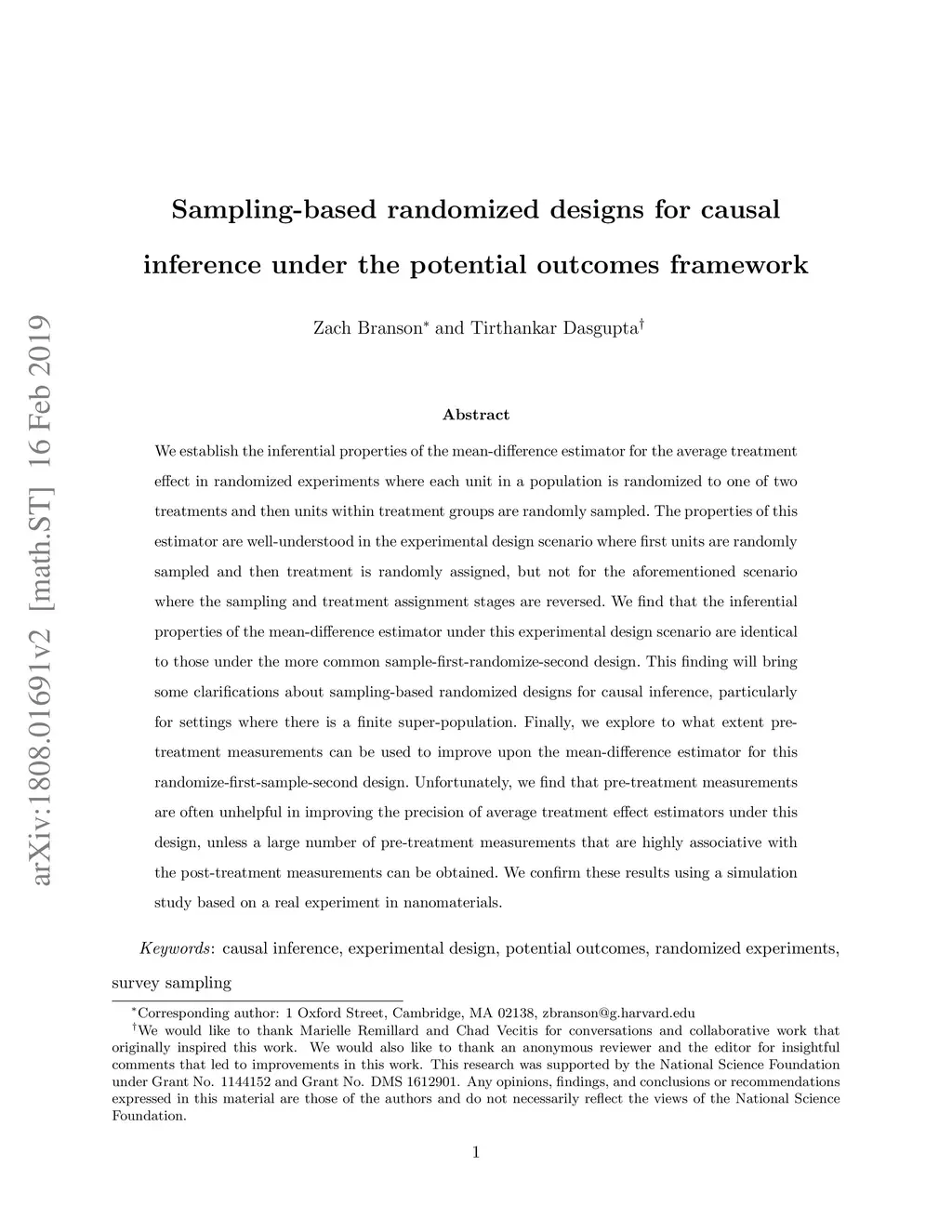 We establish the inferential properties of the mean-difference estimator for the average treatment effect in randomized experiments where each unit in a population is randomized to one of two treatments and then units within treatment groups are randomly sampled. The properties of this estimator are well-understood in the experimental design scenario where first units are randomly sampled and then treatment is randomly assigned, but not for the aforementioned scenario where the sampling and treatment assignment stages are reversed. We find that the inferential properties of the mean-difference estimator under this experimental design scenario are identical to those under the more common sample-first-randomize-second design. This finding will bring some clarifications about sampling-based randomized designs for causal inference, particularly for settings where there is a finite super-population. Finally, we explore to what extent pre-treatment measurements can be used to improve upon the mean-difference estimator for this randomize-first-sample-second design. Unfortunately, we find that pre-treatment measurements are often unhelpful in improving the precision of average treatment effect estimators under this design, unless a large number of pre-treatment measurements that are highly associative with the post-treatment measurements can be obtained. We confirm these results using a simulation study based on a real experiment in nanomaterials.