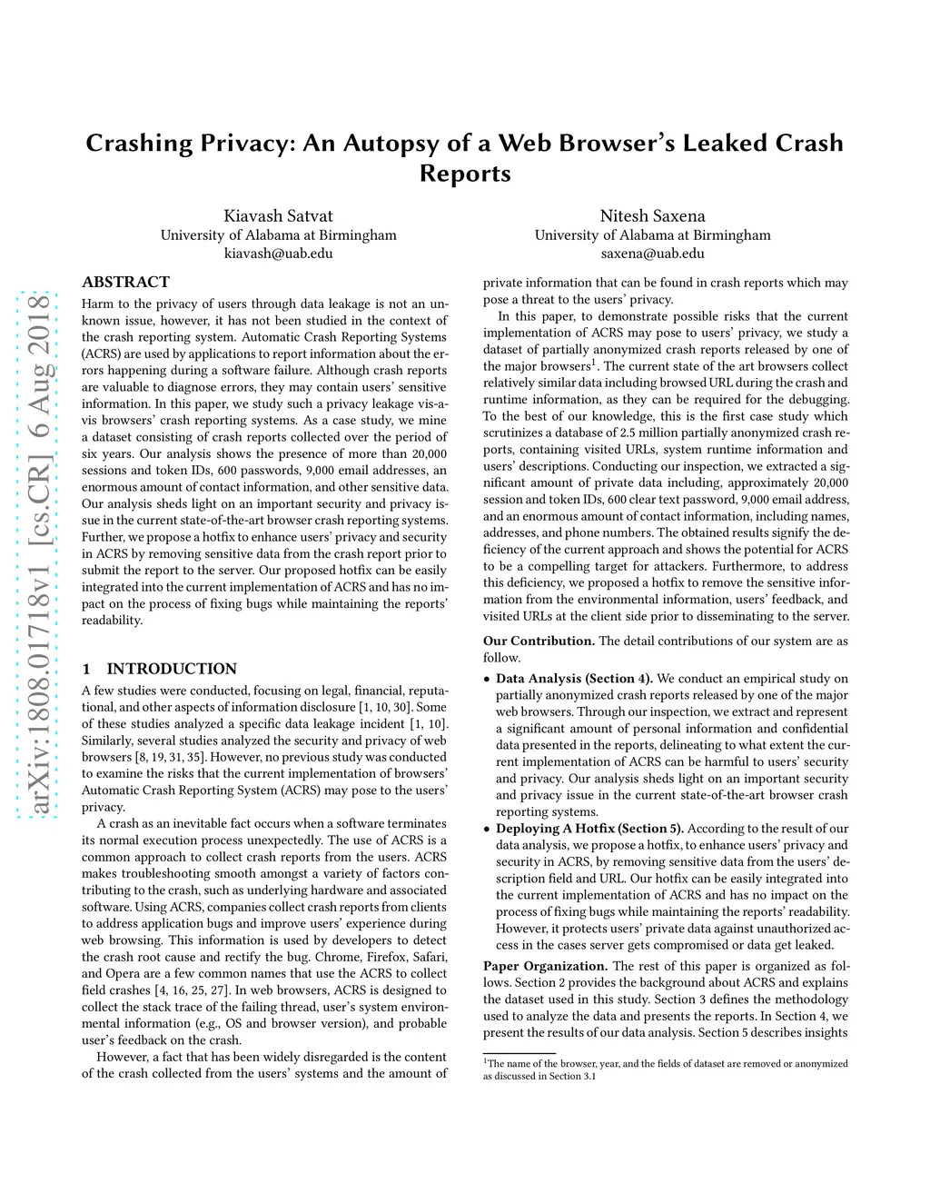 Harm to the privacy of users through data leakage is not an unknown issue, however, it has not been studied in the context of the crash reporting system. Automatic Crash Reporting Systems (ACRS) are used by applications to report information about the errors happening during a software failure. Although crash reports are valuable to diagnose errors, they may contain users' sensitive information. In this paper, we study such a privacy leakage vis-a-vis browsers' crash reporting systems. As a case study, we mine a dataset consisting of crash reports collected over the period of six years. Our analysis shows the presence of more than 20,000 sessions and token IDs, 600 passwords, 9,000 email addresses, an enormous amount of contact information, and other sensitive data. Our analysis sheds light on an important security and privacy issue in the current state-of-the-art browser crash reporting systems. Further, we propose a hotfix to enhance users' privacy and security in ACRS by removing sensitive data from the crash report prior to submit the report to the server. Our proposed hotfix can be easily integrated into the current implementation of ACRS and has no impact on the process of fixing bugs while maintaining the reports' readability.