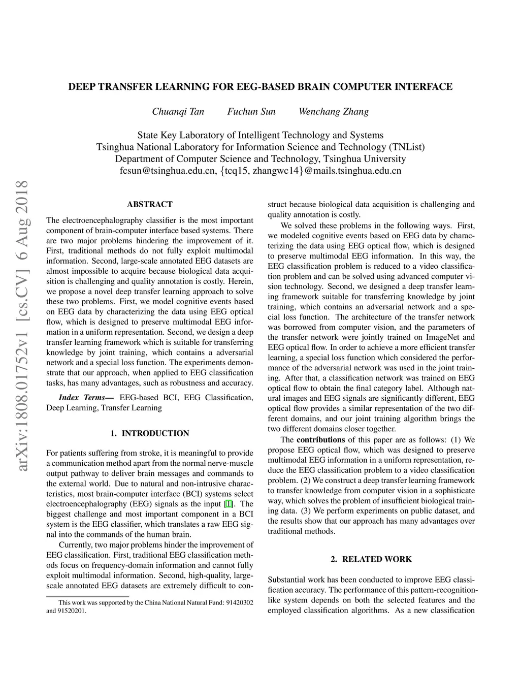 The electroencephalography classifier is the most important component of brain-computer interface based systems. There are two major problems hindering the improvement of it. First, traditional methods do not fully exploit multimodal information. Second, large-scale annotated EEG datasets are almost impossible to acquire because biological data acquisition is challenging and quality annotation is costly. Herein, we propose a novel deep transfer learning approach to solve these two problems. First, we model cognitive events based on EEG data by characterizing the data using EEG optical flow, which is designed to preserve multimodal EEG information in a uniform representation. Second, we design a deep transfer learning framework which is suitable for transferring knowledge by joint training, which contains a adversarial network and a special loss function. The experiments demonstrate that our approach, when applied to EEG classification tasks, has many advantages, such as robustness and accuracy.