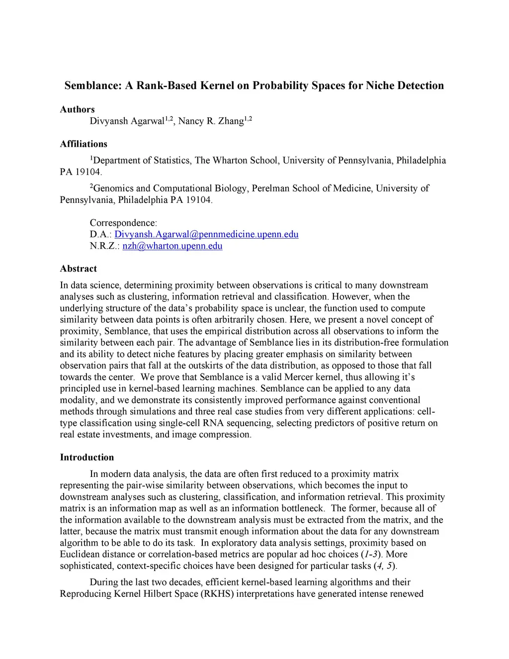 In data science, determining proximity between observations is critical to many downstream analyses such as clustering, information retrieval and classification. However, when the underlying structure of the data probability space is unclear, the function used to compute similarity between data points is often arbitrarily chosen. Here, we present a novel concept of proximity, Semblance, that uses the empirical distribution across all observations to inform the similarity between each pair. The advantage of Semblance lies in its distribution free formulation and its ability to detect niche features by placing greater emphasis on similarity between observation pairs that fall at the outskirts of the data distribution, as opposed to those that fall towards the center. We prove that Semblance is a valid Mercer kernel, thus allowing its principled use in kernel based learning machines. Semblance can be applied to any data modality, and we demonstrate its consistently improved performance against conventional methods through simulations and three real case studies from very different applications, viz. cell type classification using single cell RNA sequencing, selecting predictors of positive return on real estate investments, and image compression.