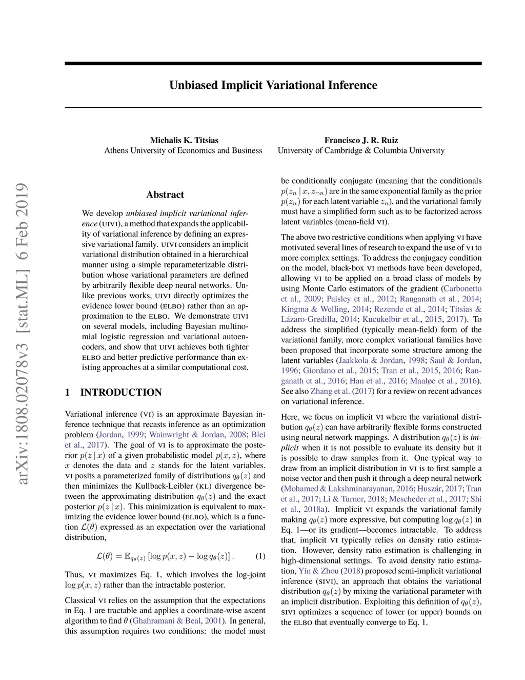 We develop unbiased implicit variational inference (UIVI), a method that expands the applicability of variational inference by defining an expressive variational family. UIVI considers an implicit variational distribution obtained in a hierarchical manner using a simple reparameterizable distribution whose variational parameters are defined by arbitrarily flexible deep neural networks. Unlike previous works, UIVI directly optimizes the evidence lower bound (ELBO) rather than an approximation to the ELBO. We demonstrate UIVI on several models, including Bayesian multinomial logistic regression and variational autoencoders, and show that UIVI achieves both tighter ELBO and better predictive performance than existing approaches at a similar computational cost.