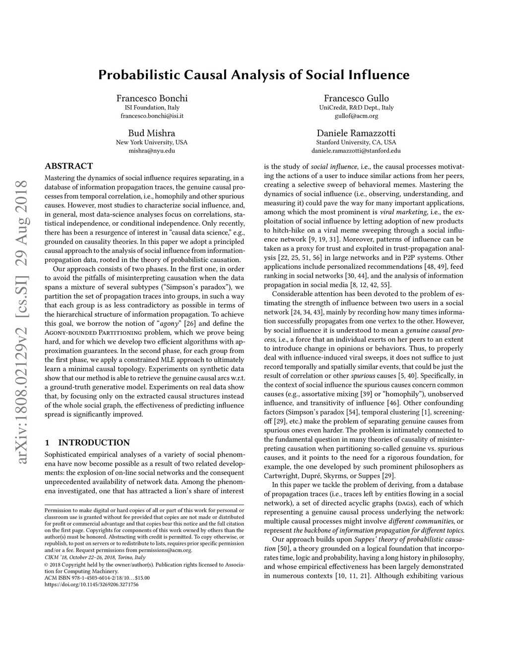 Mastering the dynamics of social influence requires separating, in a database of information propagation traces, the genuine causal processes from temporal correlation, i.e., homophily and other spurious causes. However, most studies to characterize social influence, and, in general, most data-science analyses focus on correlations, statistical independence, or conditional independence. Only recently, there has been a resurgence of interest in "causal data science", e.g., grounded on causality theories. In this paper we adopt a principled causal approach to the analysis of social influence from information-propagation data, rooted in the theory of probabilistic causation. Our approach consists of two phases. In the first one, in order to avoid the pitfalls of misinterpreting causation when the data spans a mixture of several subtypes ("Simpson's paradox"), we partition the set of propagation traces into groups, in such a way that each group is as less contradictory as possible in terms of the hierarchical structure of information propagation. To achieve this goal, we borrow the notion of "agony" and define the Agony-bounded Partitioning problem, which we prove being hard, and for which we develop two efficient algorithms with approximation guarantees. In the second phase, for each group from the first phase, we apply a constrained MLE approach to ultimately learn a minimal causal topology. Experiments on synthetic data show that our method is able to retrieve the genuine causal arcs w.r.t. a ground-truth generative model. Experiments on real data show that, by focusing only on the extracted causal structures instead of the whole social graph, the effectiveness of predicting influence spread is significantly improved.