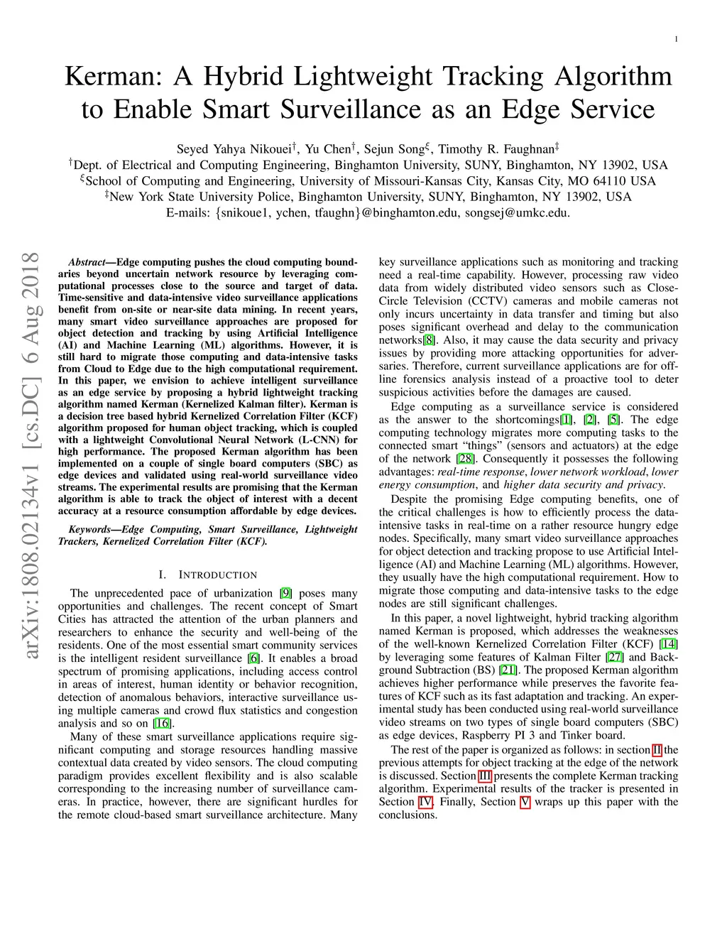 Edge computing pushes the cloud computing boundaries beyond uncertain network resource by leveraging computational processes close to the source and target of data. Time-sensitive and data-intensive video surveillance applications benefit from on-site or near-site data mining. In recent years, many smart video surveillance approaches are proposed for object detection and tracking by using Artificial Intelligence (AI) and Machine Learning (ML) algorithms. However, it is still hard to migrate those computing and data-intensive tasks from Cloud to Edge due to the high computational requirement. In this paper, we envision to achieve intelligent surveillance as an edge service by proposing a hybrid lightweight tracking algorithm named Kerman (Kernelized Kalman filter). Kerman is a decision tree based hybrid Kernelized Correlation Filter (KCF) algorithm proposed for human object tracking, which is coupled with a lightweight Convolutional Neural Network (L-CNN) for high performance. The proposed Kerman algorithm has been implemented on a couple of single board computers (SBC) as edge devices and validated using real-world surveillance video streams. The experimental results are promising that the Kerman algorithm is able to track the object of interest with a decent accuracy at a resource consumption affordable by edge devices.
