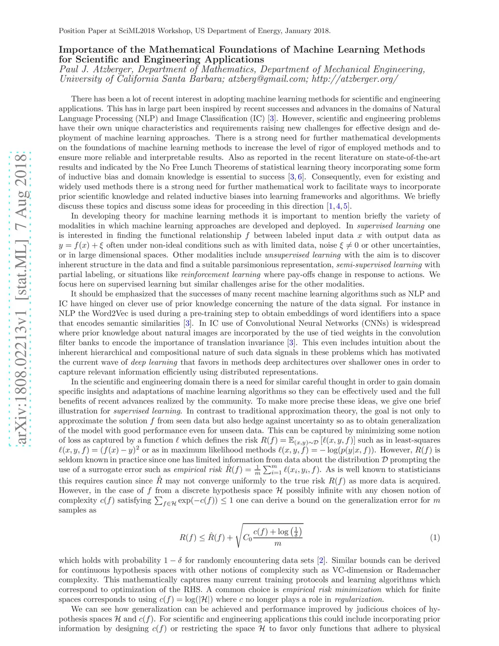 There has been a lot of recent interest in adopting machine learning methods for scientific and engineering applications. This has in large part been inspired by recent successes and advances in the domains of Natural Language Processing (NLP) and Image Classification (IC). However, scientific and engineering problems have their own unique characteristics and requirements raising new challenges for effective design and deployment of machine learning approaches. There is a strong need for further mathematical developments on the foundations of machine learning methods to increase the level of rigor of employed methods and to ensure more reliable and interpretable results. Also as reported in the recent literature on state-of-the-art results and indicated by the No Free Lunch Theorems of statistical learning theory incorporating some form of inductive bias and domain knowledge is essential to success. Consequently, even for existing and widely used methods there is a strong need for further mathematical work to facilitate ways to incorporate prior scientific knowledge and related inductive biases into learning frameworks and algorithms. We briefly discuss these topics and discuss some ideas proceeding in this direction.