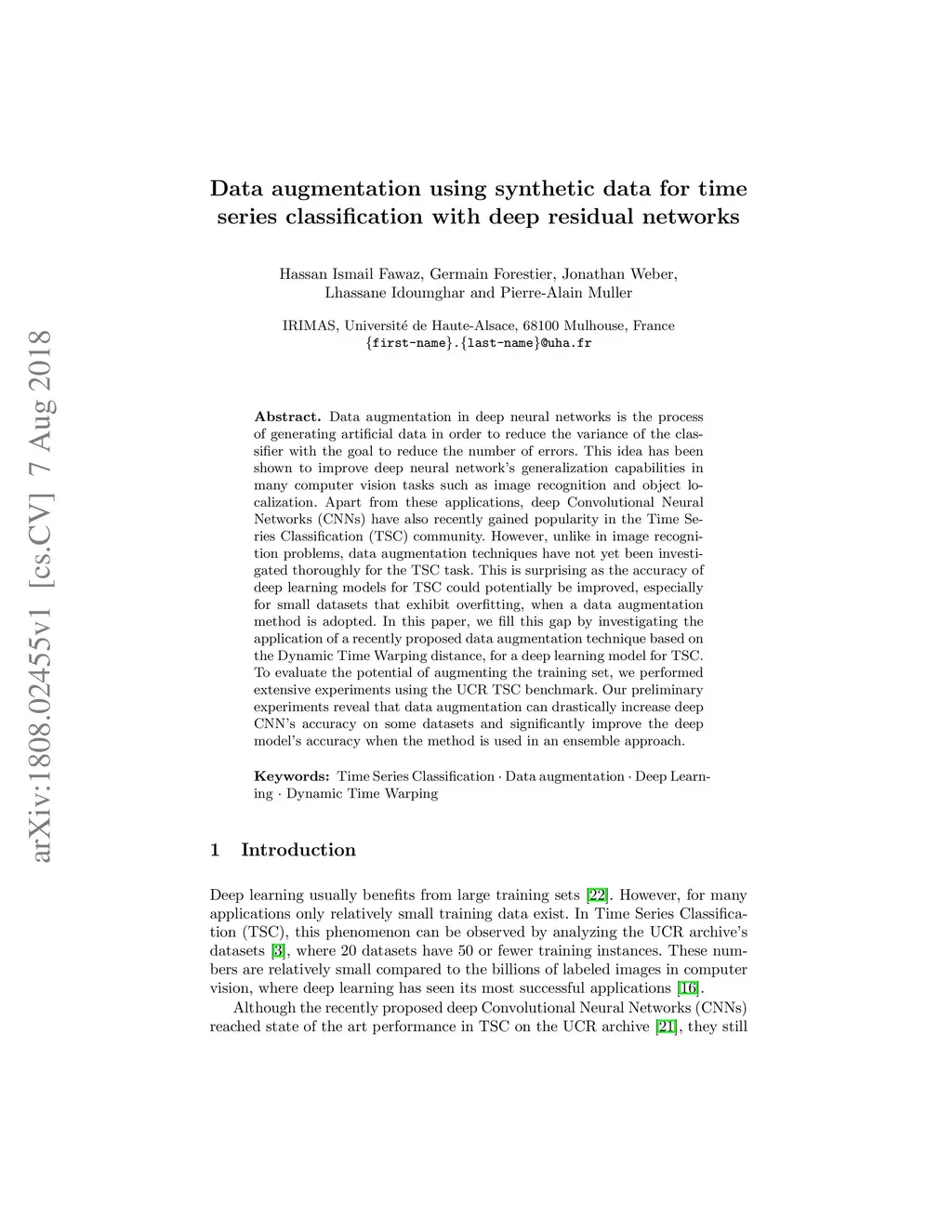 Data augmentation in deep neural networks is the process of generating artificial data in order to reduce the variance of the classifier with the goal to reduce the number of errors. This idea has been shown to improve deep neural network's generalization capabilities in many computer vision tasks such as image recognition and object localization. Apart from these applications, deep Convolutional Neural Networks (CNNs) have also recently gained popularity in the Time Series Classification (TSC) community. However, unlike in image recognition problems, data augmentation techniques have not yet been investigated thoroughly for the TSC task. This is surprising as the accuracy of deep learning models for TSC could potentially be improved, especially for small datasets that exhibit overfitting, when a data augmentation method is adopted. In this paper, we fill this gap by investigating the application of a recently proposed data augmentation technique based on the Dynamic Time Warping distance, for a deep learning model for TSC. To evaluate the potential of augmenting the training set, we performed extensive experiments using the UCR TSC benchmark. Our preliminary experiments reveal that data augmentation can drastically increase deep CNN's accuracy on some datasets and significantly improve the deep model's accuracy when the method is used in an ensemble approach.