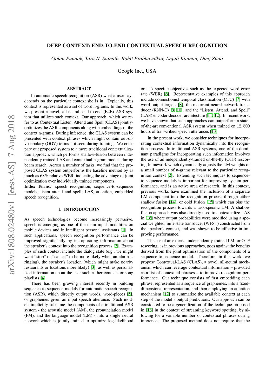 In automatic speech recognition (ASR) what a user says depends on the particular context she is in. Typically, this context is represented as a set of word n-grams. In this work, we present a novel, all-neural, end-to-end (E2E) ASR sys- tem that utilizes such context. Our approach, which we re- fer to as Contextual Listen, Attend and Spell (CLAS) jointly- optimizes the ASR components along with embeddings of the context n-grams. During inference, the CLAS system can be presented with context phrases which might contain out-of- vocabulary (OOV) terms not seen during training. We com- pare our proposed system to a more traditional contextualiza- tion approach, which performs shallow-fusion between inde- pendently trained LAS and contextual n-gram models during beam search. Across a number of tasks, we find that the pro- posed CLAS system outperforms the baseline method by as much as 68% relative WER, indicating the advantage of joint optimization over individually trained components. Index Terms: speech recognition, sequence-to-sequence models, listen attend and spell, LAS, attention, embedded speech recognition.
