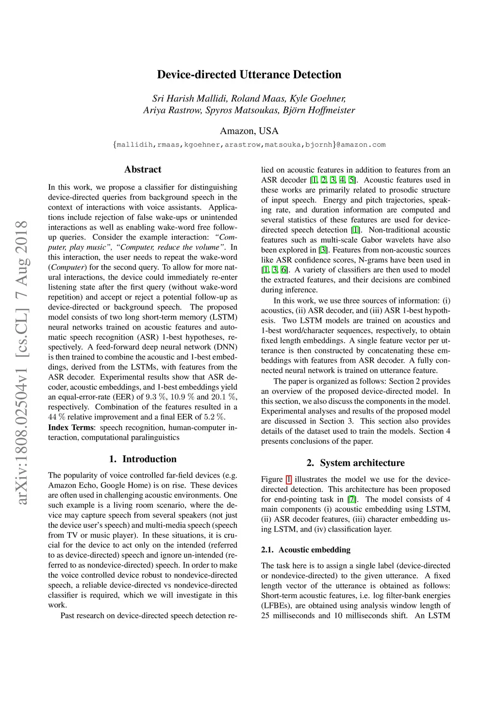 In this work, we propose a classifier for distinguishing device-directed queries from background speech in the context of interactions with voice assistants. Applications include rejection of false wake-ups or unintended interactions as well as enabling wake-word free follow-up queries. Consider the example interaction: . In this interaction, the user needs to repeat the wake-word () for the second query. To allow for more natural interactions, the device could immediately re-enter listening state after the first query (without wake-word repetition) and accept or reject a potential follow-up as device-directed or background speech. The proposed model consists of two long short-term memory (LSTM) neural networks trained on acoustic features and automatic speech recognition (ASR) 1-best hypotheses, respectively. A feed-forward deep neural network (DNN) is then trained to combine the acoustic and 1-best embeddings, derived from the LSTMs, with features from the ASR decoder. Experimental results show that ASR decoder, acoustic embeddings, and 1-best embeddings yield an equal-error-rate (EER) of , and , respectively. Combination of the features resulted in a relative improvement and a final EER of .