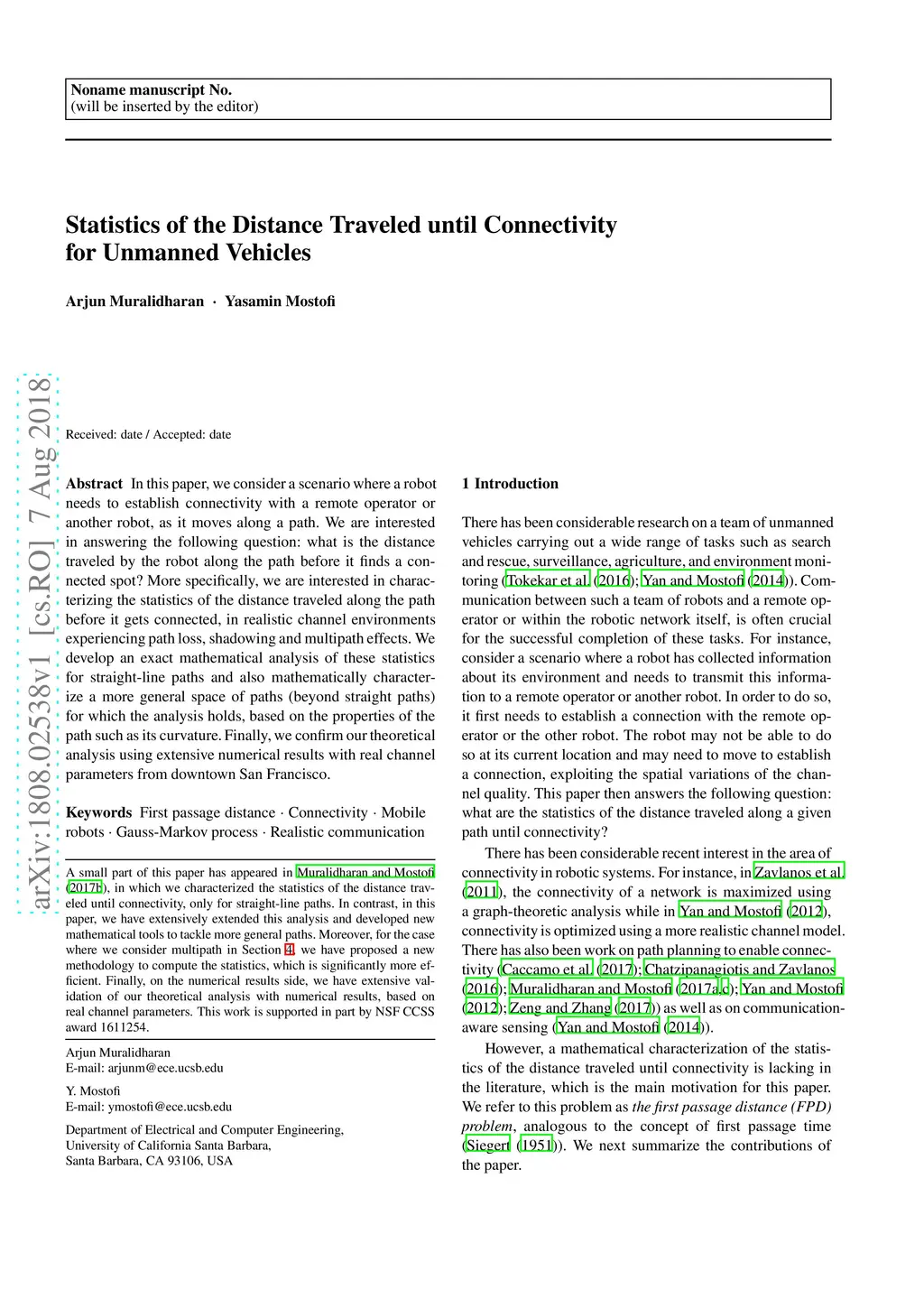 In this paper, we consider a scenario where a robot needs to establish connectivity with a remote operator or another robot, as it moves along a path. We are interested in answering the following question: what is the distance traveled by the robot along the path before it finds a connected spot? More specifically, we are interested in characterizing the statistics of the distance traveled along the path before it gets connected, in realistic channel environments experiencing path loss, shadowing and multipath effects. We develop an exact mathematical analysis of these statistics for straight-line paths and also mathematically characterize a more general space of paths (beyond straight paths) for which the analysis holds, based on the properties of the path such as its curvature. Finally, we confirm our theoretical analysis using extensive numerical results with real channel parameters from downtown San Francisco.