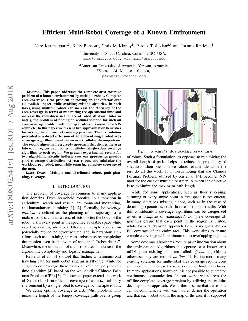 This paper addresses the complete area coverage problem of a known environment by multiple-robots. Complete area coverage is the problem of moving an end-effector over all available space while avoiding existing obstacles. In such tasks, using multiple robots can increase the efficiency of the area coverage in terms of minimizing the operational time and increase the robustness in the face of robot attrition. Unfortunately, the problem of finding an optimal solution for such an area coverage problem with multiple robots is known to be NP-complete. In this paper we present two approximation heuristics for solving the multi-robot coverage problem. The first solution presented is a direct extension of an efficient single robot area coverage algorithm, based on an exact cellular decomposition. The second algorithm is a greedy approach that divides the area into equal regions and applies an efficient single-robot coverage algorithm to each region. We present experimental results for two algorithms. Results indicate that our approaches provide good coverage distribution between robots and minimize the workload per robot, meanwhile ensuring complete coverage of the area.