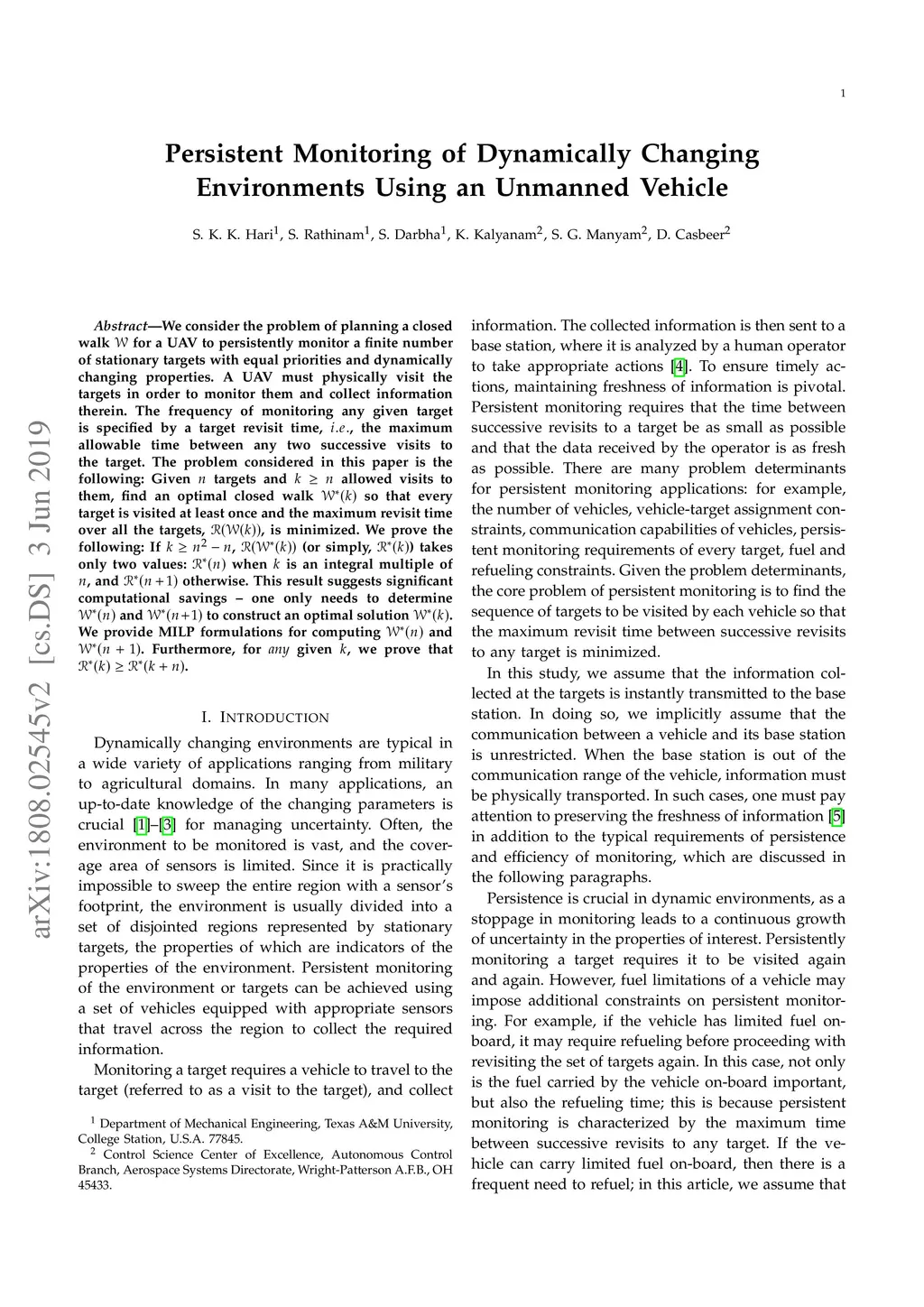 We consider the problem of planning a closed walk for a UAV to persistently monitor a finite number of stationary targets with equal priorities and dynamically changing properties. A UAV must physically visit the targets in order to monitor them and collect information therein. The frequency of monitoring any given target is specified by a target revisit time, , the maximum allowable time between any two successive visits to the target. The problem considered in this paper is the following: Given targets and allowed visits to them, find an optimal closed walk so that every target is visited at least once and the maximum revisit time over all the targets, , is minimized. We prove the following: If , (or simply, ) takes only two values: when is an integral multiple of , and otherwise. This result suggests significant computational savings - one only needs to determine and to construct an optimal solution . We provide MILP formulations for computing and . Furthermore, for {\it any} given , we prove that .