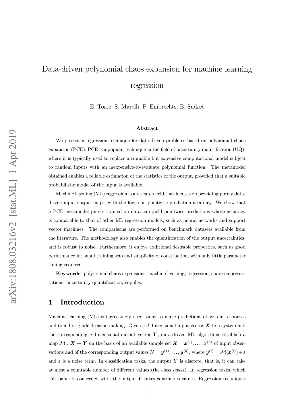We present a regression technique for data-driven problems based on polynomial chaos expansion (PCE). PCE is a popular technique in the field of uncertainty quantification (UQ), where it is typically used to replace a runnable but expensive computational model subject to random inputs with an inexpensive-to-evaluate polynomial function. The metamodel obtained enables a reliable estimation of the statistics of the output, provided that a suitable probabilistic model of the input is available. Machine learning (ML) regression is a research field that focuses on providing purely data-driven input-output maps, with the focus on pointwise prediction accuracy. We show that a PCE metamodel purely trained on data can yield pointwise predictions whose accuracy is comparable to that of other ML regression models, such as neural networks and support vector machines. The comparisons are performed on benchmark datasets available from the literature. The methodology also enables the quantification of the output uncertainties, and is robust to noise. Furthermore, it enjoys additional desirable properties, such as good performance for small training sets and simplicity of construction, with only little parameter tuning required.