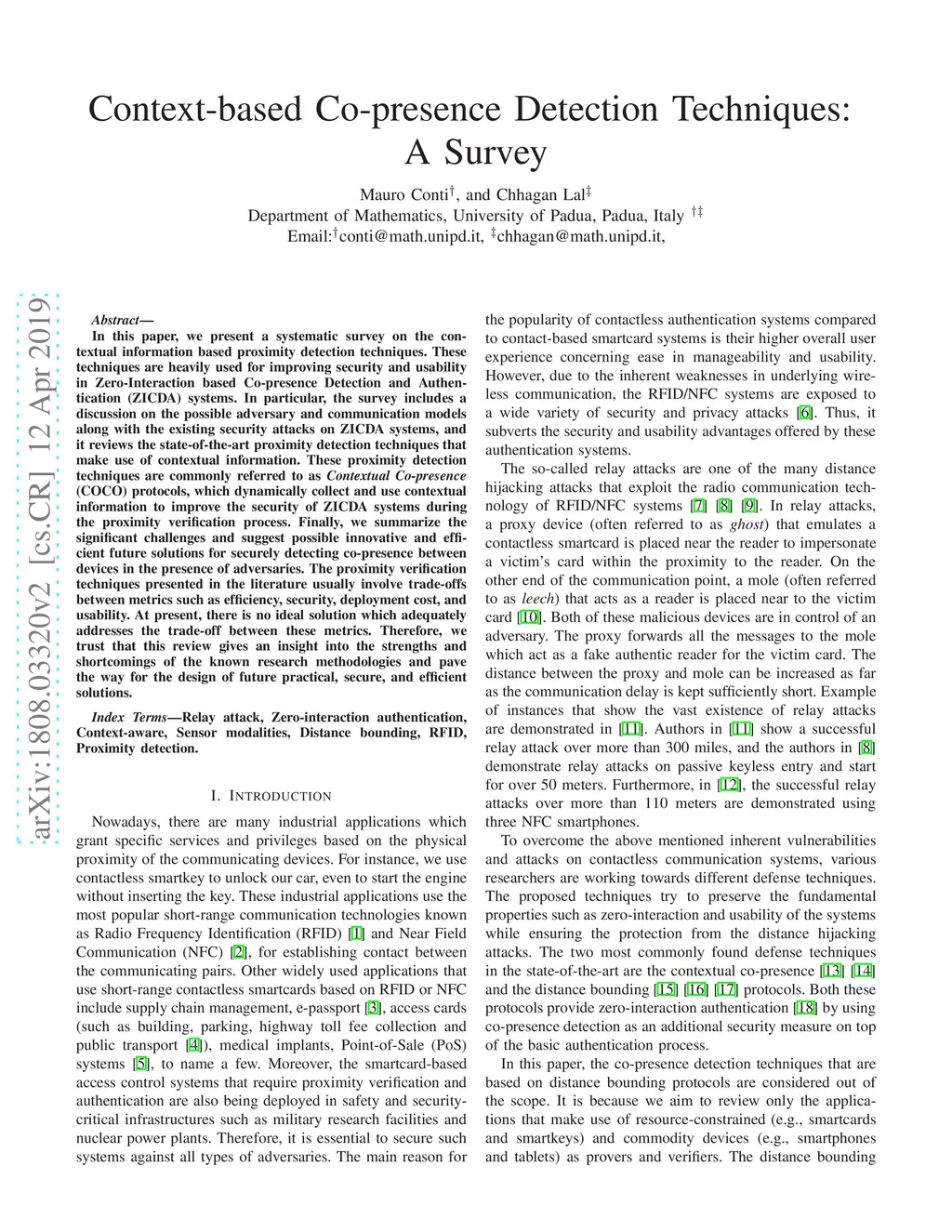 In this paper, we present a systematic survey on the contextual information based proximity detection techniques. These techniques are heavily used for improving security and usability in Zero-Interaction based Co-presence Detection and Authentication (ZICDA) systems. In particular, the survey includes a discussion on the possible adversary and communication models along with the existing security attacks on ZICDA systems, and it reviews the state-of-the-art proximity detection techniques that make use of contextual information. These proximity detection techniques are commonly referred to as Contextual Co-presence (COCO) protocols, which dynamically collect and use contextual information to improve the security of ZICDA systems during the proximity verification process. Finally, we summarize the significant challenges and suggest possible innovative and efficient future solutions for securely detecting co-presence between devices in the presence of adversaries. The proximity verification techniques presented in the literature usually involve trade-offs between metrics such as efficiency, security, deployment cost, and usability. At present, there is no ideal solution which adequately addresses the trade-off between these metrics. Therefore, we trust that this review gives an insight into the strengths and shortcomings of the known research methodologies and pave the way for the design of future practical, secure, and efficient solutions.