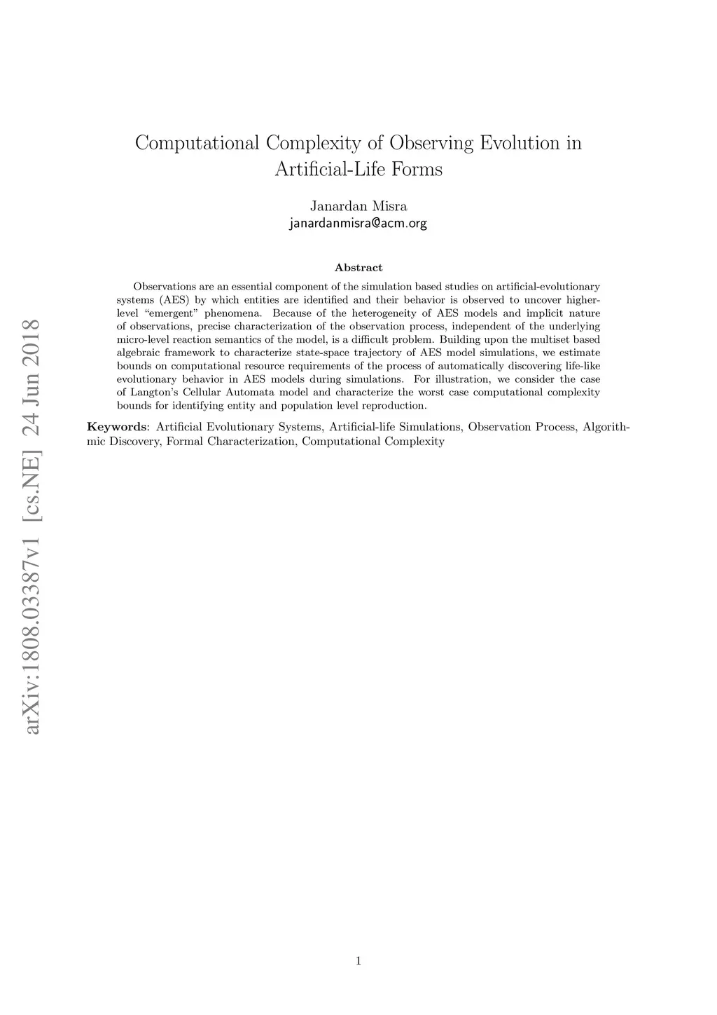 Observations are an essential component of the simulation based studies on artificial-evolutionary systems (AES) by which entities are identified and their behavior is observed to uncover higher-level "emergent" phenomena. Because of the heterogeneity of AES models and implicit nature of observations, precise characterization of the observation process, independent of the underlying micro-level reaction semantics of the model, is a difficult problem. Building upon the multiset based algebraic framework to characterize state-space trajectory of AES model simulations, we estimate bounds on computational resource requirements of the process of automatically discovering life-like evolutionary behavior in AES models during simulations. For illustration, we consider the case of Langton's Cellular Automata model and characterize the worst case computational complexity bounds for identifying entity and population level reproduction.