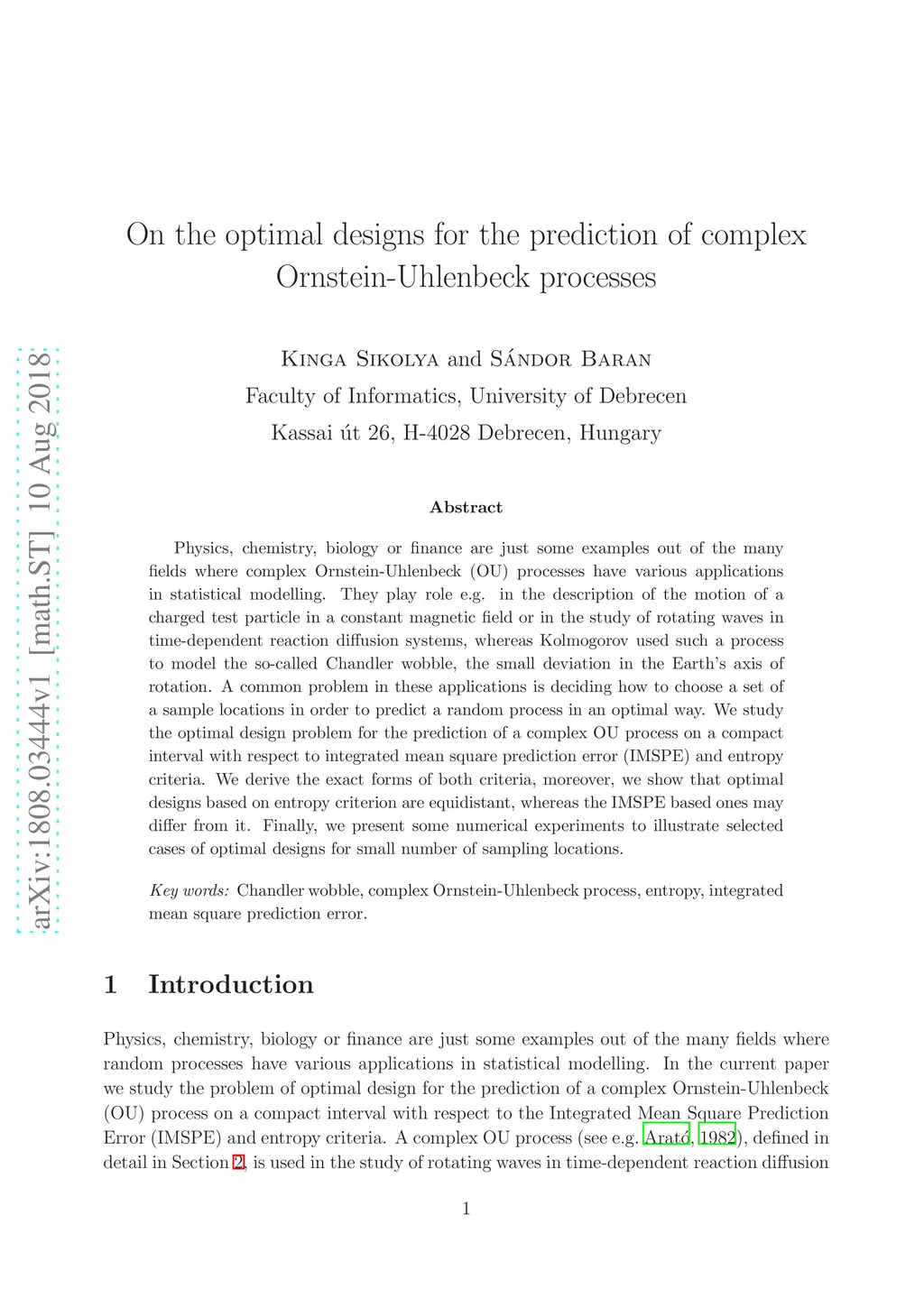 Physics, chemistry, biology or finance are just some examples out of the many fields where complex Ornstein-Uhlenbeck (OU) processes have various applications in statistical modelling. They play role e.g. in the description of the motion of a charged test particle in a constant magnetic field or in the study of rotating waves in time-dependent reaction diffusion systems, whereas Kolmogorov used such a process to model the so-called Chandler wobble, the small deviation in the Earth's axis of rotation. A common problem in these applications is deciding how to choose a set of a sample locations in order to predict a random process in an optimal way. We study the optimal design problem for the prediction of a complex OU process on a compact interval with respect to integrated mean square prediction error (IMSPE) and entropy criteria. We derive the exact forms of both criteria, moreover, we show that optimal designs based on entropy criterion are equidistant, whereas the IMSPE based ones may differ from it. Finally, we present some numerical experiments to illustrate selected cases of optimal designs for small number of sampling locations.