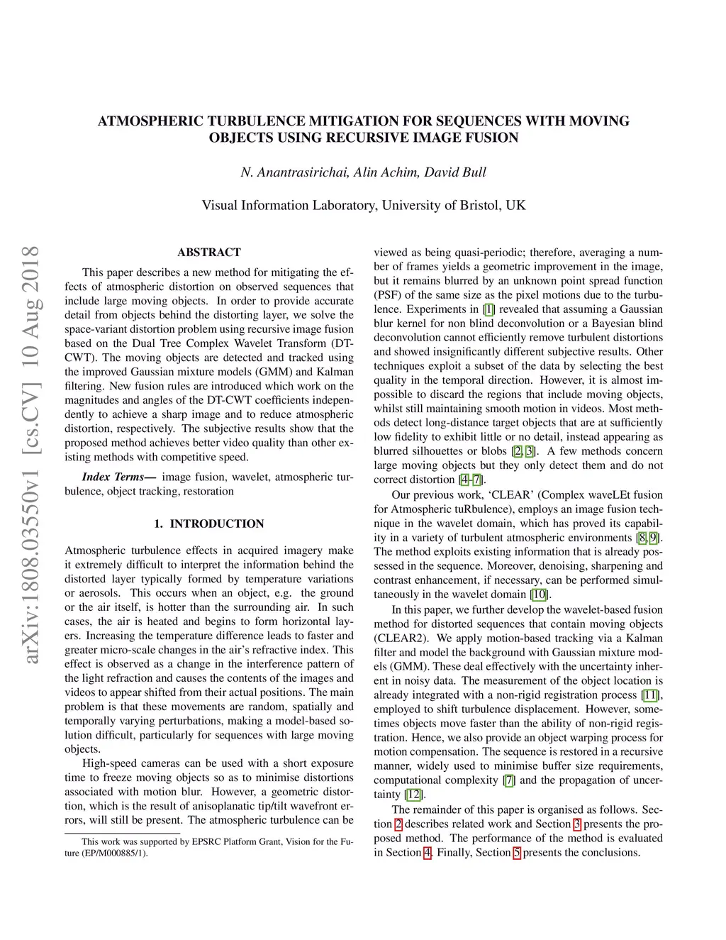 This paper describes a new method for mitigating the effects of atmospheric distortion on observed sequences that include large moving objects. In order to provide accurate detail from objects behind the distorting layer, we solve the space-variant distortion problem using recursive image fusion based on the Dual Tree Complex Wavelet Transform (DT-CWT). The moving objects are detected and tracked using the improved Gaussian mixture models (GMM) and Kalman filtering. New fusion rules are introduced which work on the magnitudes and angles of the DT-CWT coefficients independently to achieve a sharp image and to reduce atmospheric distortion, respectively. The subjective results show that the proposed method achieves better video quality than other existing methods with competitive speed.