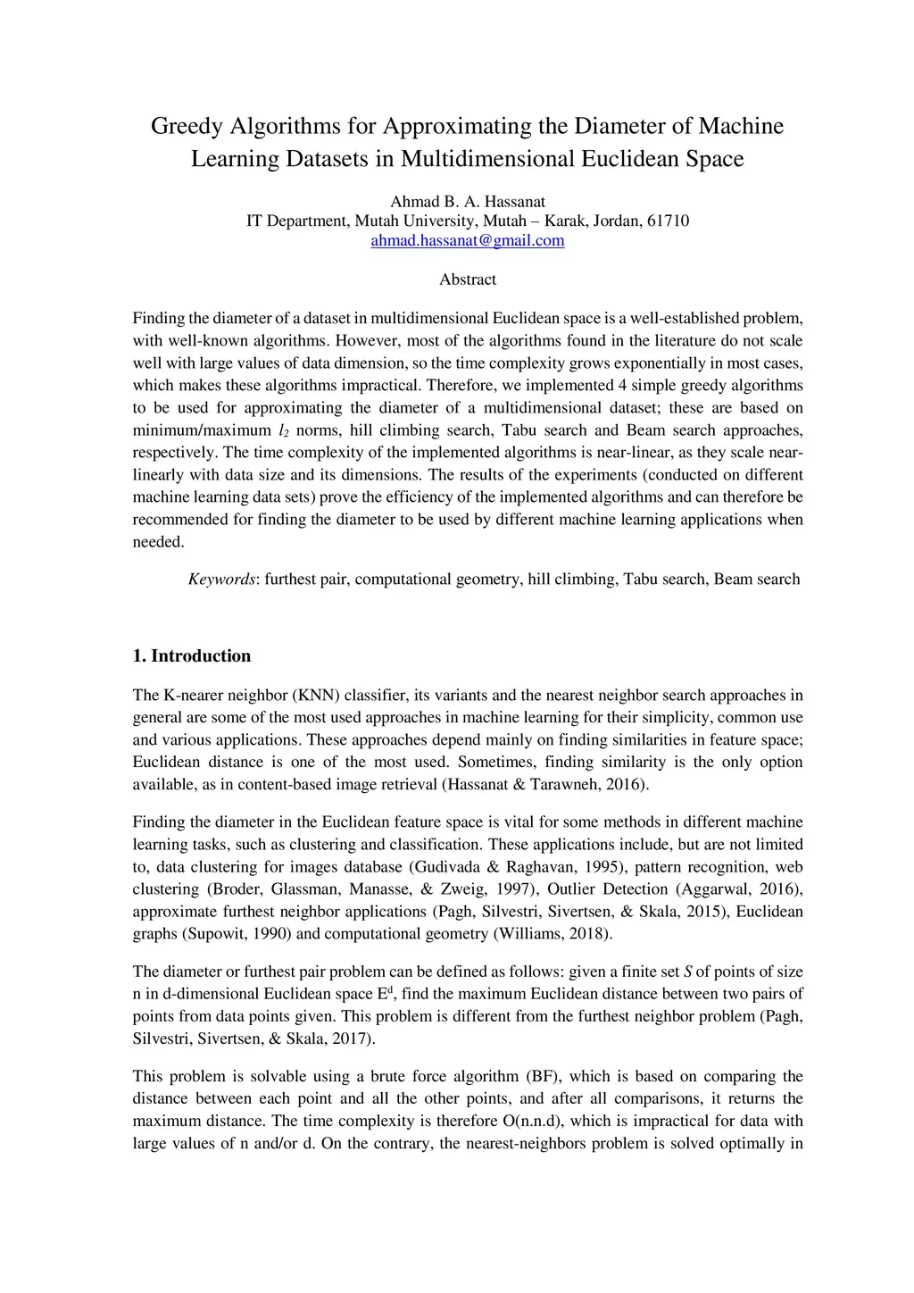 Greedy Algorithms for Approximating the Diameter of Machine Learning