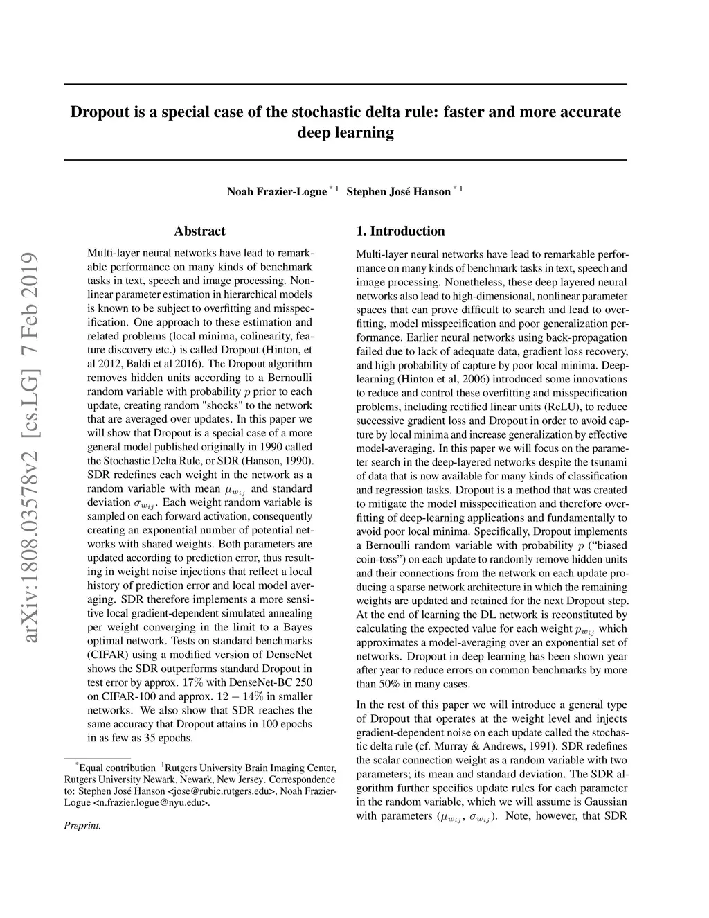 Multi-layer neural networks have lead to remarkable performance on many kinds of benchmark tasks in text, speech and image processing. Nonlinear parameter estimation in hierarchical models is known to be subject to overfitting and misspecification. One approach to these estimation and related problems (local minima, colinearity, feature discovery etc.) is called Dropout (Hinton, et al 2012, Baldi et al 2016). The Dropout algorithm removes hidden units according to a Bernoulli random variable with probability prior to each update, creating random "shocks" to the network that are averaged over updates. In this paper we will show that Dropout is a special case of a more general model published originally in 1990 called the Stochastic Delta Rule, or SDR (Hanson, 1990). SDR redefines each weight in the network as a random variable with mean and standard deviation . Each weight random variable is sampled on each forward activation, consequently creating an exponential number of potential networks with shared weights. Both parameters are updated according to prediction error, thus resulting in weight noise injections that reflect a local history of prediction error and local model averaging. SDR therefore implements a more sensitive local gradient-dependent simulated annealing per weight converging in the limit to a Bayes optimal network. Tests on standard benchmarks (CIFAR) using a modified version of DenseNet shows the SDR outperforms standard Dropout in test error by approx. with DenseNet-BC 250 on CIFAR-100 and approx. in smaller networks. We also show that SDR reaches the same accuracy that Dropout attains in 100 epochs in as few as 35 epochs.