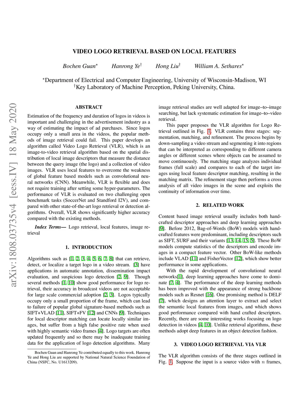 Estimation of the frequency and duration of logos in videos is important and challenging in the advertisement industry as a way of estimating the impact of ad purchases. Since logos occupy only a small area in the videos, the popular methods of image retrieval could fail. This paper develops an algorithm called Video Logo Retrieval (VLR), which is an image-to-video retrieval algorithm based on the spatial distribution of local image descriptors that measure the distance between the query image (the logo) and a collection of video images. VLR uses local features to overcome the weakness of global feature-based models such as convolutional neural networks (CNN). Meanwhile, VLR is flexible and does not require training after setting some hyper-parameters. The performance of VLR is evaluated on two challenging open benchmark tasks (SoccerNet and Standford I2V), and compared with other state-of-the-art logo retrieval or detection algorithms. Overall, VLR shows significantly higher accuracy compared with the existing methods.