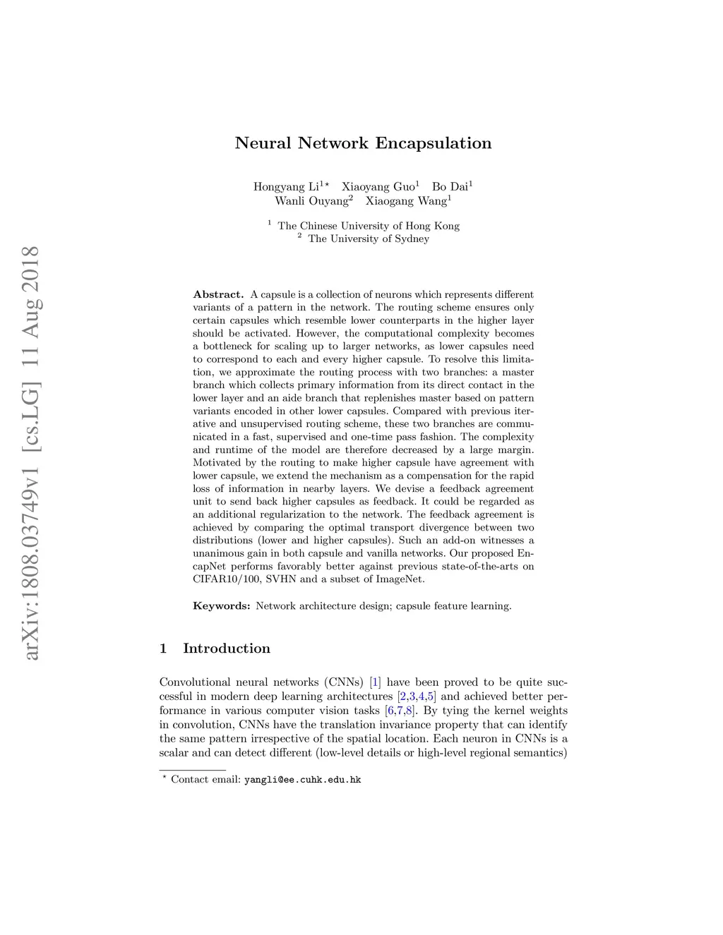 A capsule is a collection of neurons which represents different variants of a pattern in the network. The routing scheme ensures only certain capsules which resemble lower counterparts in the higher layer should be activated. However, the computational complexity becomes a bottleneck for scaling up to larger networks, as lower capsules need to correspond to each and every higher capsule. To resolve this limitation, we approximate the routing process with two branches: a master branch which collects primary information from its direct contact in the lower layer and an aide branch that replenishes master based on pattern variants encoded in other lower capsules. Compared with previous iterative and unsupervised routing scheme, these two branches are communicated in a fast, supervised and one-time pass fashion. The complexity and runtime of the model are therefore decreased by a large margin. Motivated by the routing to make higher capsule have agreement with lower capsule, we extend the mechanism as a compensation for the rapid loss of information in nearby layers. We devise a feedback agreement unit to send back higher capsules as feedback. It could be regarded as an additional regularization to the network. The feedback agreement is achieved by comparing the optimal transport divergence between two distributions (lower and higher capsules). Such an add-on witnesses a unanimous gain in both capsule and vanilla networks. Our proposed EncapNet performs favorably better against previous state-of-the-arts on CIFAR10/100, SVHN and a subset of ImageNet.