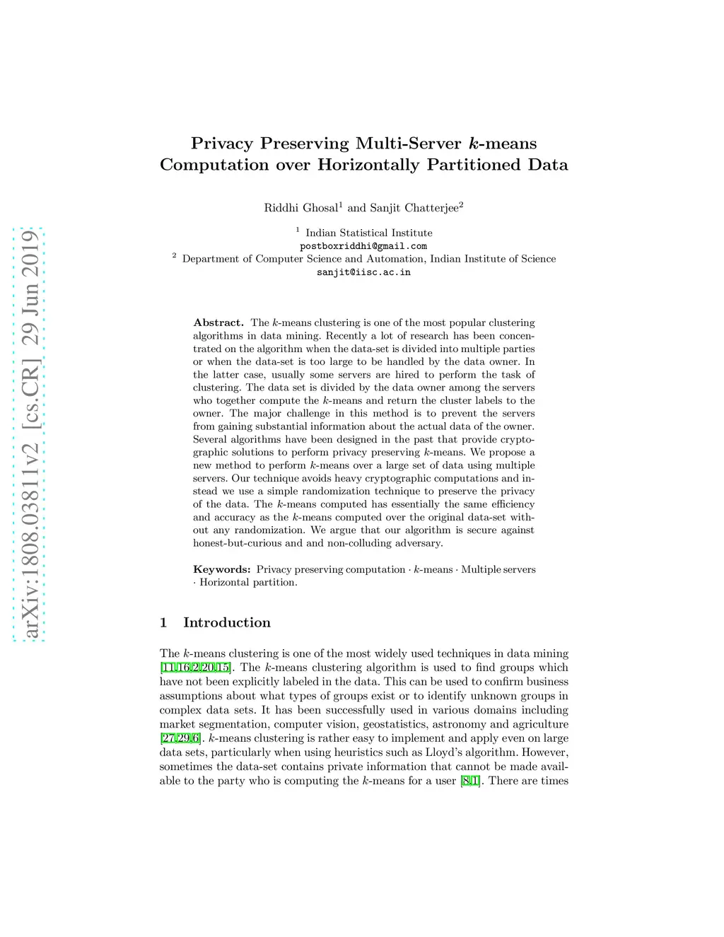 The k-means clustering is one of the most popular clustering algorithms in data mining. Recently a lot of research has been concentrated on the algorithm when the dataset is divided into multiple parties or when the dataset is too large to be handled by the data owner. In the latter case, usually some servers are hired to perform the task of clustering. The dataset is divided by the data owner among the servers who together perform the k-means and return the cluster labels to the owner. The major challenge in this method is to prevent the servers from gaining substantial information about the actual data of the owner. Several algorithms have been designed in the past that provide cryptographic solutions to perform privacy preserving k-means. We provide a new method to perform k-means over a large set using multiple servers. Our technique avoids heavy cryptographic computations and instead we use a simple randomization technique to preserve the privacy of the data. The k-means computed has exactly the same efficiency and accuracy as the k-means computed over the original dataset without any randomization. We argue that our algorithm is secure against honest but curious and passive adversary.