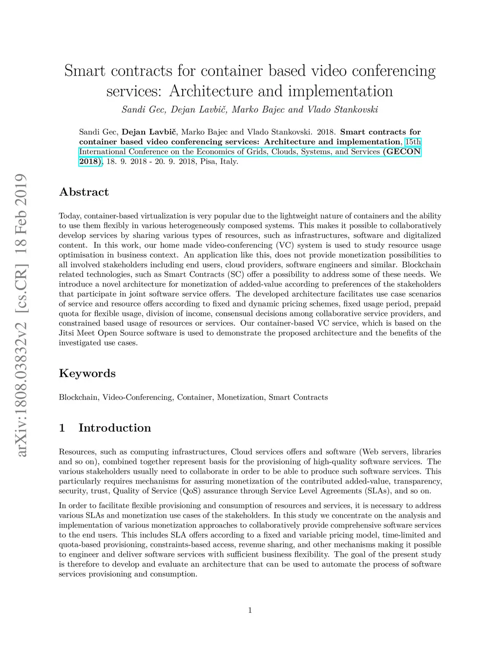 Today, container-based virtualization is very popular due to the lightweight nature of containers and the ability to use them flexibly in various heterogeneously composed systems. This makes it possible to collaboratively develop services by sharing various types of resources, such as infrastructures, software and digitalized content. In this work, our home made video-conferencing (VC) system is used to study resource usage optimisation in business context. An application like this, does not provide monetization possibilities to all involved stakeholders including end users, cloud providers, software engineers and similar. Blockchain related technologies, such as Smart Contracts (SC) offer a possibility to address some of these needs. We introduce a novel architecture for monetization of added-value according to preferences of the stakeholders that participate in joint software service offers. The developed architecture facilitates use case scenarios of service and resource offers according to fixed and dynamic pricing schemes, fixed usage period, prepaid quota for flexible usage, division of income, consensual decisions among collaborative service providers, and constrained based usage of resources or services. Our container-based VC service, which is based on the Jitsi Meet Open Source software is used to demonstrate the proposed architecture and the benefits of the investigated use cases.