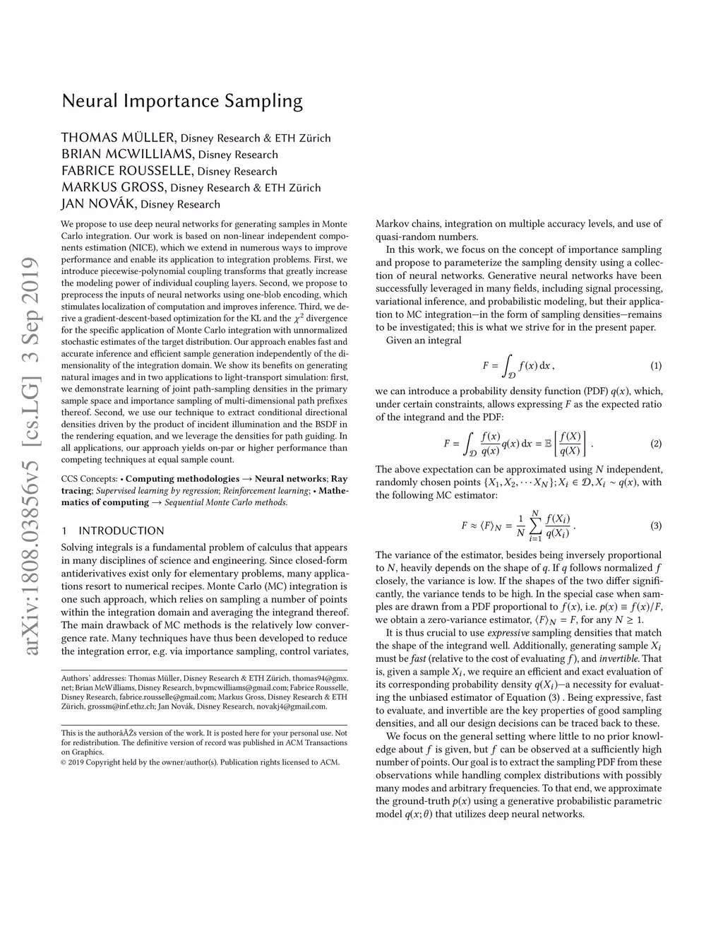 We propose to use deep neural networks for generating samples in Monte Carlo integration. Our work is based on non-linear independent components estimation (NICE), which we extend in numerous ways to improve performance and enable its application to integration problems. First, we introduce piecewise-polynomial coupling transforms that greatly increase the modeling power of individual coupling layers. Second, we propose to preprocess the inputs of neural networks using one-blob encoding, which stimulates localization of computation and improves inference. Third, we derive a gradient-descent-based optimization for the KL and the divergence for the specific application of Monte Carlo integration with unnormalized stochastic estimates of the target distribution. Our approach enables fast and accurate inference and efficient sample generation independently of the dimensionality of the integration domain. We show its benefits on generating natural images and in two applications to light-transport simulation: first, we demonstrate learning of joint path-sampling densities in the primary sample space and importance sampling of multi-dimensional path prefixes thereof. Second, we use our technique to extract conditional directional densities driven by the product of incident illumination and the BSDF in the rendering equation, and we leverage the densities for path guiding. In all applications, our approach yields on-par or higher performance than competing techniques at equal sample count.