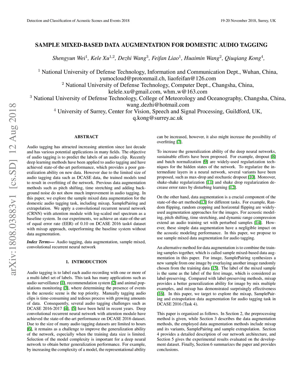 Sample Mixed-Based Data Augmentation for Domestic Audio Tagging