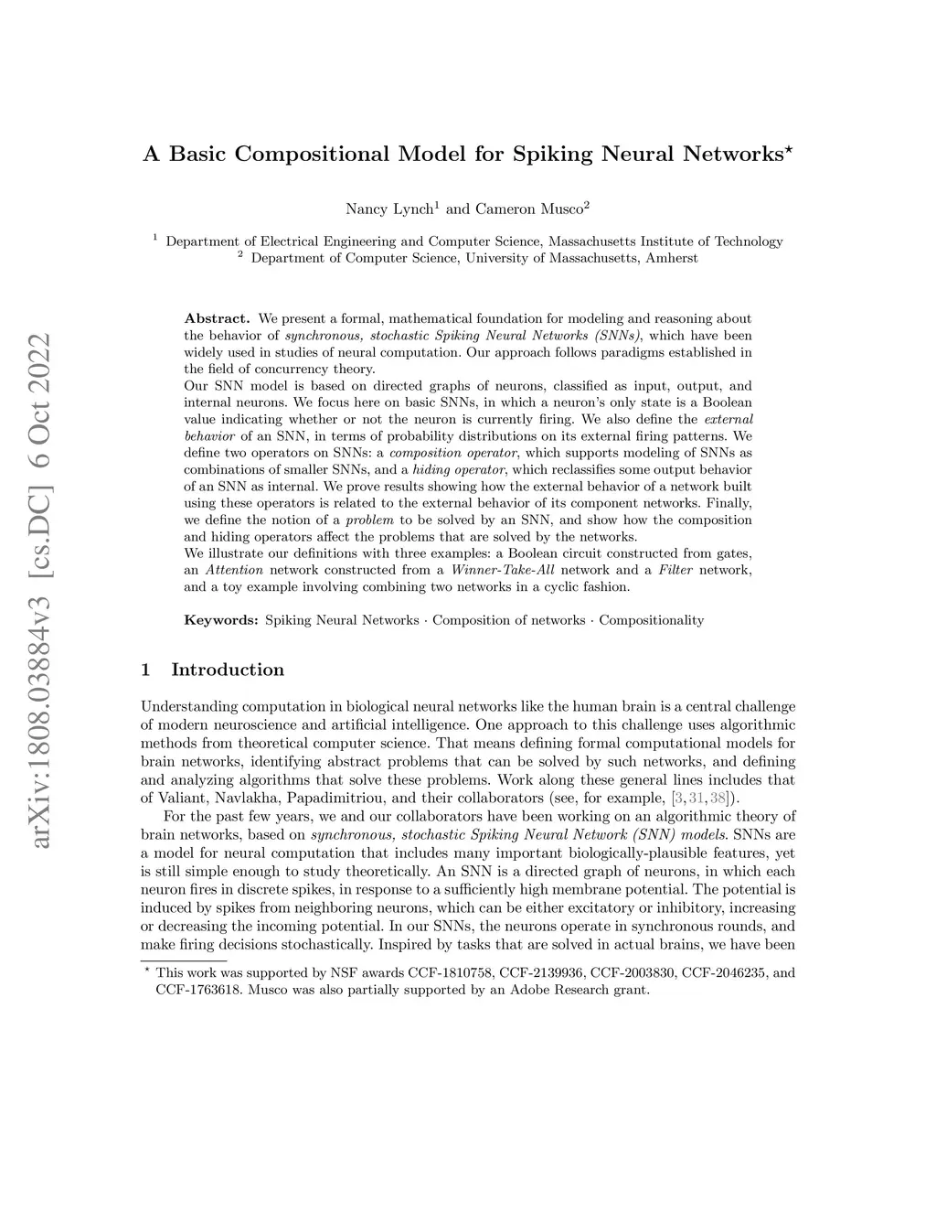 We present a formal, mathematical foundation for modeling and reasoning about the behavior of , , which have been widely used in studies of neural computation. Our approach follows paradigms established in the field of concurrency theory. Our SNN model is based on directed graphs of neurons, classified as input, output, and internal neurons. We focus here on basic SNNs, in which a neuron's only state is a Boolean value indicating whether or not the neuron is currently firing. We also define the of an SNN, in terms of probability distributions on its external firing patterns. We define two operators on SNNs: a , which supports modeling of SNNs as combinations of smaller SNNs, and a , which reclassifies some output behavior of an SNN as internal. We prove results showing how the external behavior of a network built using these operators is related to the external behavior of its component networks. Finally, we define the notion of a to be solved by an SNN, and show how the composition and hiding operators affect the problems that are solved by the networks. We illustrate our definitions with three examples: a Boolean circuit constructed from gates, an network constructed from a -- network and a network, and a toy example involving combining two networks in a cyclic fashion.