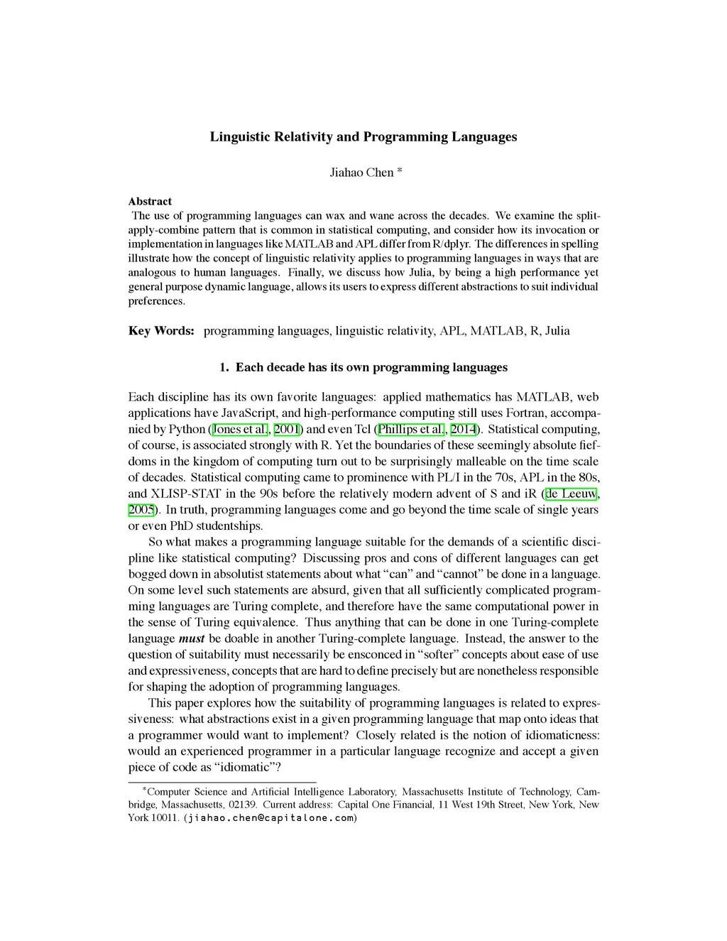The use of programming languages can wax and wane across the decades. We examine the split-apply- combine pattern that is common in statistical computing, and consider how its invocation or implementation in languages like MATLAB and APL differ from R/dplyr. The differences in spelling illustrate how the concept of linguistic relativity applies to programming languages in ways that are analogous to human languages. Finally, we discuss how Julia, by being a high performance yet general purpose dynamic language, allows its users to express different abstractions to suit individual preferences.