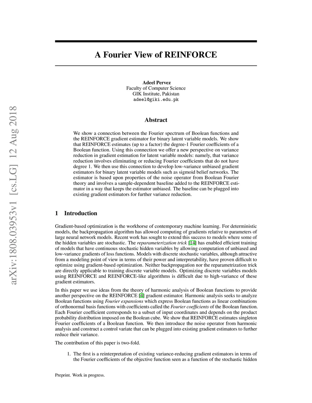 We show a connection between the Fourier spectrum of Boolean functions and the REINFORCE gradient estimator for binary latent variable models. We show that REINFORCE estimates (up to a factor) the degree-1 Fourier coefficients of a Boolean function. Using this connection we offer a new perspective on variance reduction in gradient estimation for latent variable models: namely, that variance reduction involves eliminating or reducing Fourier coefficients that do not have degree 1. We then use this connection to develop low-variance unbiased gradient estimators for binary latent variable models such as sigmoid belief networks. The estimator is based upon properties of the noise operator from Boolean Fourier theory and involves a sample-dependent baseline added to the REINFORCE estimator in a way that keeps the estimator unbiased. The baseline can be plugged into existing gradient estimators for further variance reduction.