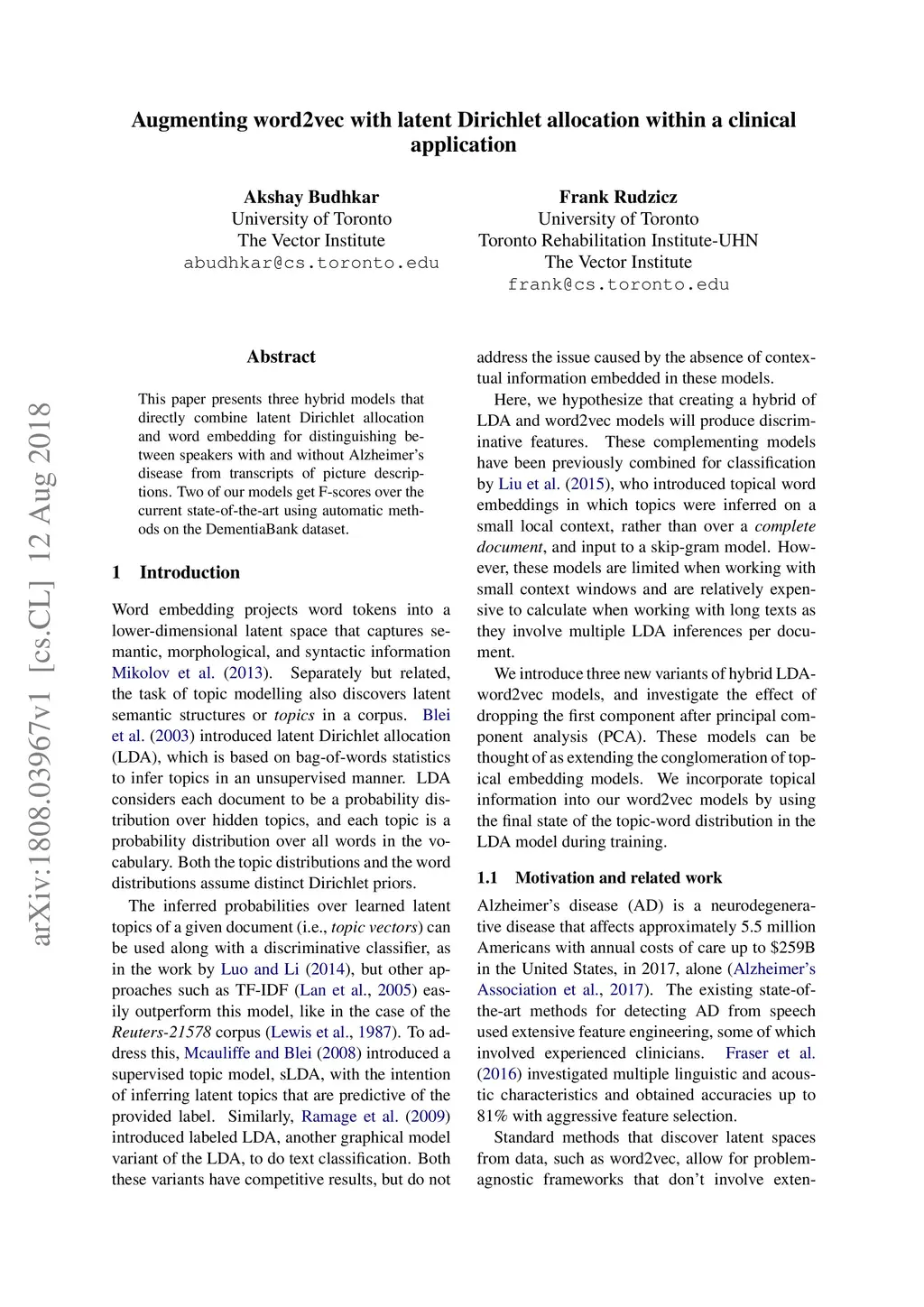 This paper presents three hybrid models that directly combine latent Dirichlet allocation and word embedding for distinguishing between speakers with and without Alzheimer's disease from transcripts of picture descriptions. Two of our models get F-scores over the current state-of-the-art using automatic methods on the DementiaBank dataset.