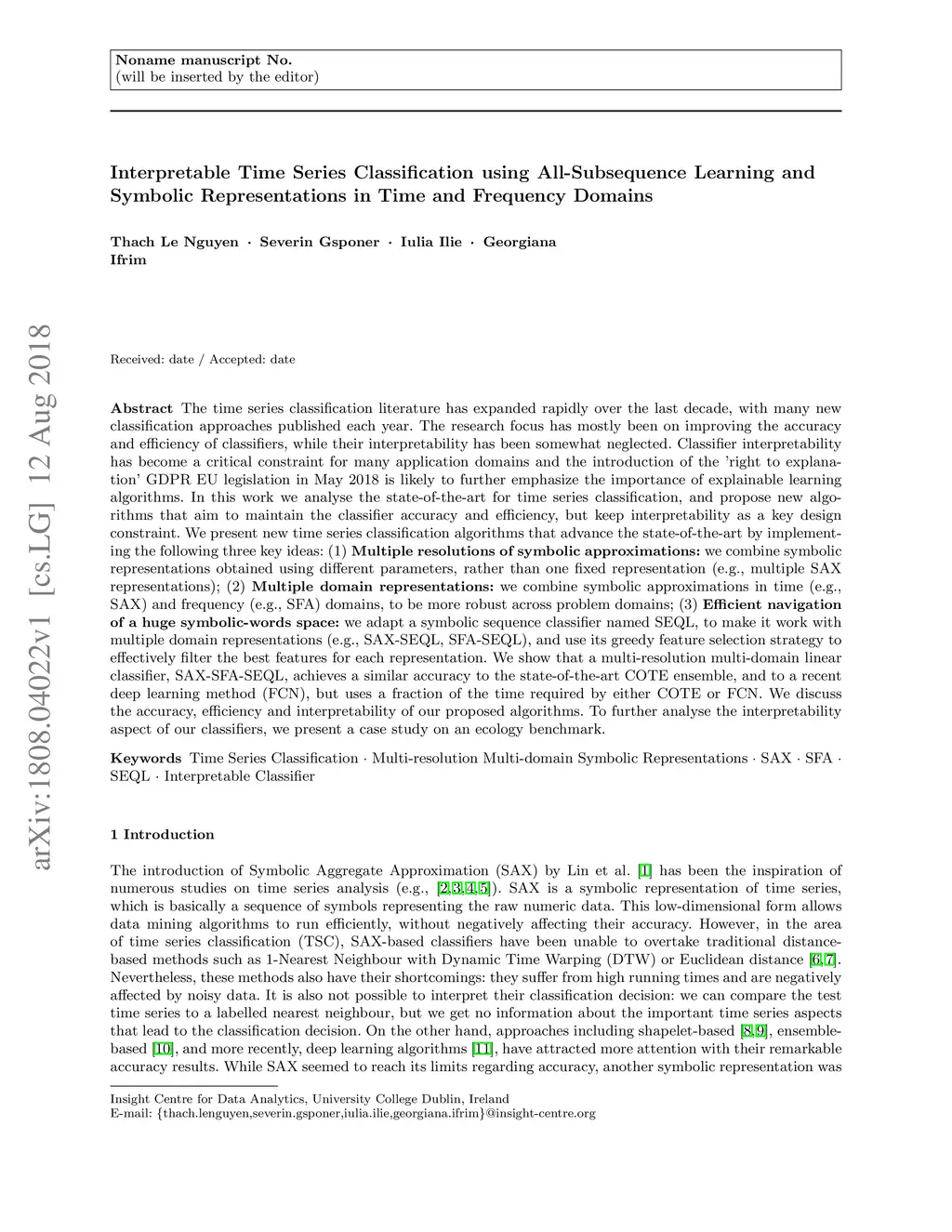 The time series classification literature has expanded rapidly over the last decade, with many new classification approaches published each year. The research focus has mostly been on improving the accuracy and efficiency of classifiers, while their interpretability has been somewhat neglected. Classifier interpretability has become a critical constraint for many application domains and the introduction of the 'right to explanation' GDPR EU legislation in May 2018 is likely to further emphasize the importance of explainable learning algorithms. In this work we analyse the state-of-the-art for time series classification, and propose new algorithms that aim to maintain the classifier accuracy and efficiency, but keep interpretability as a key design constraint. We present new time series classification algorithms that advance the state-of-the-art by implementing the following three key ideas: (1) Multiple resolutions of symbolic approximations: we combine symbolic representations obtained using different parameters; (2) Multiple domain representations: we combine symbolic approximations in time (e.g., SAX) and frequency (e.g., SFA) domains; (3) Efficient navigation of a huge symbolic-words space: we adapt a symbolic sequence classifier named SEQL, to make it work with multiple domain representations (e.g., SAX-SEQL, SFA-SEQL), and use its greedy feature selection strategy to effectively filter the best features for each representation. We show that a multi-resolution multi-domain linear classifier, SAX-SFA-SEQL, achieves a similar accuracy to the state-of-the-art COTE ensemble, and to a recent deep learning method (FCN), but uses a fraction of the time required by either COTE or FCN. We discuss the accuracy, efficiency and interpretability of our proposed algorithms. To further analyse the interpretability aspect of our classifiers, we present a case study on an ecology benchmark.