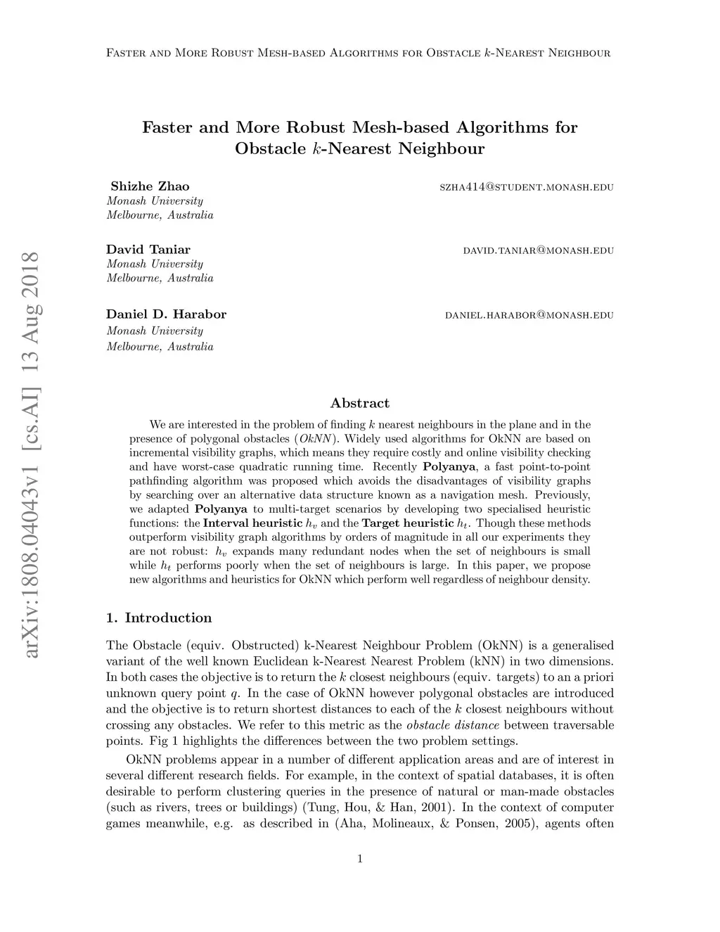 We are interested in the problem of finding nearest neighbours in the plane and in the presence of polygonal obstacles (). Widely used algorithms for OkNN are based on incremental visibility graphs, which means they require costly and online visibility checking and have worst-case quadratic running time. Recently , a fast point-to-point pathfinding algorithm was proposed which avoids the disadvantages of visibility graphs by searching over an alternative data structure known as a navigation mesh. Previously, we adapted to multi-target scenarios by developing two specialised heuristic functions: the and the . Though these methods outperform visibility graph algorithms by orders of magnitude in all our experiments they are not robust: expands many redundant nodes when the set of neighbours is small while performs poorly when the set of neighbours is large. In this paper, we propose new algorithms and heuristics for OkNN which perform well regardless of neighbour density.
